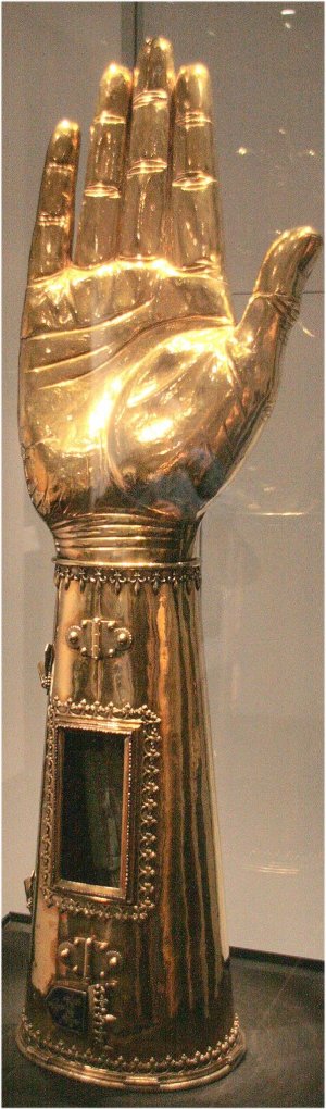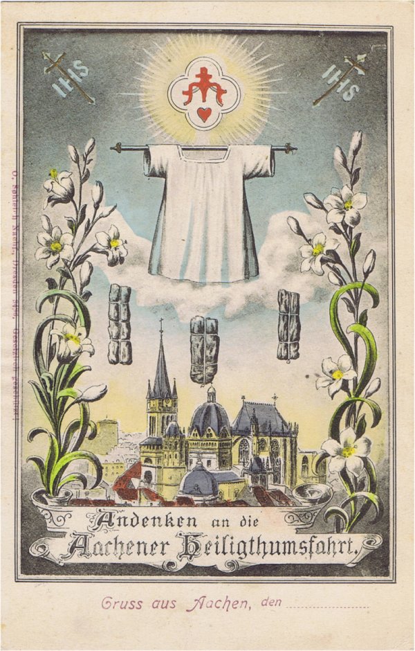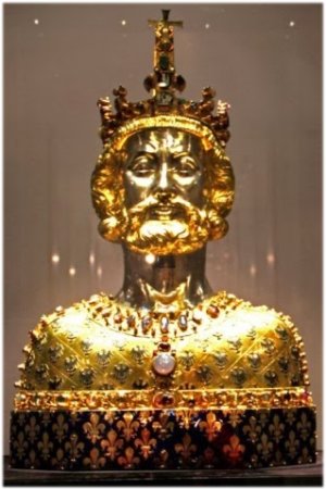Voor de ware geschiedenis van Aken kun je niet afgaan op de folders van de Toeristen Verein, de Duitse VVV. Hoewel daar soms opmerkelijke zaken in staan, is het geheel vooral toeristisch reclame voor Aken. Dan ben je toch aangewezen op de serieuze historisch wetenschappelijke literatuur. Wat in de schatkamer van de Akense Dom te zien is, blijkt niet ouder dan de 12de eeuw (op een enkel item na). Een lijst overgenomen uit de plaatselijke literatuur laat het volgende zien: de zegelstempel (1528), armreliekhouder (1481: zie afbeelding rechtsonder), borstkruis (vermoedelijk 1165), Karelsbuste (1349: zie afbeelding hiernaast), Lotharkruis (14e eeuw), Akens Altaar (1515/1520), Apostel Antependium (1480), Kruisigingsaltaar (1470), Ivoren schrijftafeltje (rond 1100), Reliekhouder Agnus Dei (1515), Monstrans (1520), Kelk (16e eeuw), Altaar van Paus Gregorius (1525), Scepter (1220), Zilveren Boekband (1170), Cappa Leonis (14e eeuw), beeld Madonna met Kind (14e eeuw), verguld Mariabeeld (1280), de Akense Heiligdommen (14e eeuw), Simeonsreliekhouder (1330), Reliquiarium van Anastasius (eind 10e, begin 11e eeuw), wat dus het oudste stuk is. Ofwel niets uit de tijd van Karel de Grote.Pas in 1474 werd Karel de Grote in Frankrijk als voorvader van de Franse koningen geëerd. Zo 'verduits' was hij geworden!