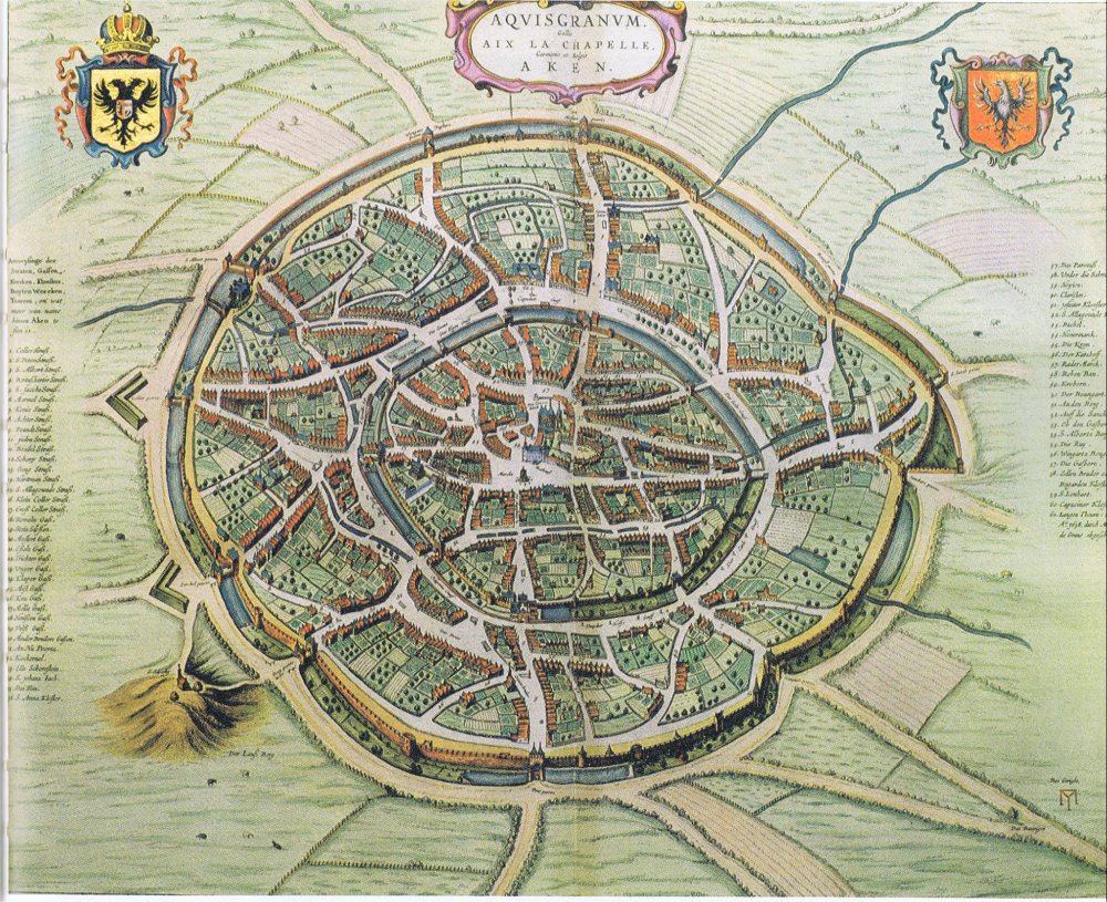 Aken zou in de Romeinse tijd al bestaan hebben onder de naam Aquisgranum of Aquae Granni. Dat is echter fantasie, want: "Der lateinische Name Aquae Granni ist weder in der antiken Literatur noch durch Inschriften bezeugt." (Bron: Joacim von Elbe, Die Römer in Deutschland. Orbis Verlag München, 1989, p.25]. Het is dus wel duidelijk dat er in Aken geen enkel archeologisch of schriftelijk bewijs is gevonden dat de plaats ooit Aquis Granni heeft geheten. Slechts de warme bronnen zijn de enige aanwijzing, maar warme bronnen waren er op veel meer plaatsen in het Romeinse Rijk. Het is dan ook niet te verklaren - welke verklaring dan ook nooit gegeven wordt- waarom Aken dan op de Romeinse Peutingerkaart ontbreekt, als het een bekende badplaats was met warme bronnen. De plaatsen met een warme bron worden op de Peutingerkaart doorgaans aangegeven met 'Aquae' of 'Aquis' met een nadere plaatsnaam en bijbehorend afbeelding van een Romeinse villa. Zie hiernaast ![]() De algemene opmerking die ook hier geldt: al bestaat er een verregaande eenstemmigheid over aannamen, dan wil dat nog niet zeggen dat het dus zo is. We zien op meerdere punten eenstemmigheid onder historici waar het slechts algemeen aanvaarde aannames betreft. Het is onduidelijk waarom Blaeu in zijn Stedenatlas van de Nederlanden Aken heeft opgenomen. Zie afbeelding hiernaast. Klik op de afbeelding voor een vergroting. Was het omdat vanuit deze vrije Rijksstad eertijds ook een expeditieleger van Willem van Oranje uitgerust werd om de Nederlanden te bevrijden? Of was Blaeu een practicus die een zo grote en belangrijke stad zo dicht bij de grens van de Nederlanden eenvoudig niet kon laten voor wat het was? We kunnen er slechts naar gissen. Aken wordt traditioneel voor de oude Karolingische hoofdstad van het Rijk van Karel de Grote ten noorden van de Alpen gehouden. Pas in 1531 moest Aken de rol van hoofdstad van het Duitse Rijk afstaan aan Frankfurt, vanwege de excentrische ligging van de stad. Vooral de nebijbeid van de Franse grens voelde men als een probleem. In 1598 kwam het stads-bestuur weer in handen van de katholieken en een bruikbare uitvalsbasis van het Nederlandse protestantisme kwam daarmee te vervallen, maar het bleef verder een vrije Rijksstad. Het Wener Congres zou in 1815 Aken aan Pruisen toevoegen. Eind oktober 1944 werd Aken als eerste grote Duitse stad door de Amerikanen veroverd, de stad was daarvoor al zwaar vernield door Geallieerde bombardementen, maar van wat er nog stond zou in zware gevechten ook weer de helft verloren gaan. Aken heeft nog steeds een excentrische ligging en de buiten wijken van de stad lopen in het noordwesten over in Nederland en in het zuidwesten in België. Het traditionele verhaal over Karolingisch Aken luidt als volgt: "De Dom met de Karolingische Pfalzkapelle van Karel de Grote is ondanks het oorlogsgeweld blijven staan. Het achthoekige koepelgebouw stamt uit het einde van de achtste eeuwen werd later nog uitgebreid met een gotisch hoogkoor. Hier werden alle Duitse keizers tot 1531 gekroond. Van de rijke kerkschatten noemen wij u alleen de kroonluchter die door Frederik I Barbarossa werd geschonken, de marmeren troonzetel van Karel de Grote en het 'Ksrl-schrein', een vroeg voorbeeld van middeleeuwse goudsmeedkunst. Nog een gebouw moet genoemd worden en dat is het gotische stadhuis uit 1350 dat gebouwd werd op fundamenten van de oudere kei-zerpalts. Over de stad Aken, waar ook de Vrede van Aken uit 1668 werd gesloten welke voor de Zuidelijke Nederlanden en met name Frans- Vlaanderen erg belangrijk was, kan uiteraard veel meer verteld worden. Maar in het kader van dit boek past slechts een dagtripje vanuit Maastricht, vandaar!" In zijn visie maakt Albert Delahaye vaak een vergelijking tussen de geschiedenis van Nijmegen en Aken. En hoewel hij de boeken 'Aachen, von den Anfängen bis zur Gegenwart' (2 delen) uit 2011 nooit gelezen kan hebben, bevestigen de Duitse historici hem op meerdere punten. Het zou voor de Nijmeegse historici nuttig zijn als zij eens, net als Blaeu, 'over de grens' zouden kijken of hun opvattingen ook in het buitenland bevestigd worden. Te denken valt aan de geschiedenis van Aken (zie hier), de geschiedenis van Noyon in de Franse literatuur en de geschiedenis van Echternach in Luxemburg.