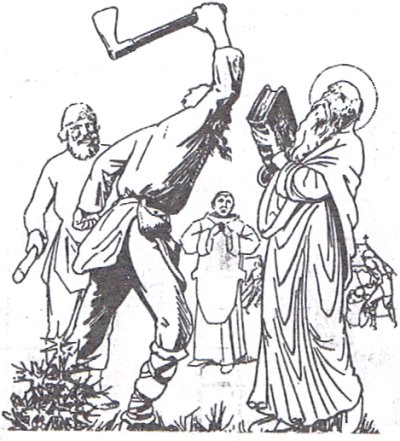 - Bonifatius werd in de 16e en 17e eeuw tijdens de Hollandse Zending door de missiekerk van Sasbout Vosmeer 'herontdekt' samen met vele andere 'vaderlandse' heiligen. Dit gebeurde in een klimaat dat prof.dr.L.J.Rogier typeerde als een samenkomen van een drietal factoren: historisch besef, nationaal gevoel en katholieke vroomheid. Vooral de katholieke vroomheid veroorzaakte na de 80-jarige oorlog een flinke herleefde impuls waarbij het historisch besef naar de achtergrond verdween. De legende werd boven de historische waarheid gesteld. De kerk van Medemblik kreeg in 1572 in 'de herontdekte traditie' als een der eerste kerken in Nederland het patronaat van Bonifatius. Enkele andere St.Bonifatiuskerken hebben een gebouwelijke historie die verder teruggaat dan de 16e eeuw, maar waarvan het patronaat van St.Bonifatius geheel onzeker is, zoals Cornwerd (13e eeuw), Elden (13e eeuw), Vries (12e eeuw?) en Ter Idzard (late 16e eeuw).- Pas in de 19e eeuw nam de verering van Bonifatius in Dokkum een plaatsgebonden karakter aan. Een melding van een eerste openbare verering en het tonen van een deel van de aan Bonifatius toegeschreven relieken in 1823 blijkt moeilijk te situeren. Deze gebeurtenis vormde de aanleiding voor een betoog over de verering van de resten van heilige. - Echt houvast geven de bronnen pas na circa 1870. In de context van de katholieke emancipatie werden tussen 1874 en 1882 enkele initiatieven ondernomen door de lokale (pastoor G.J. Demes) en regionale Friese clerus. -Er zijn wel drie boeken in omloop die vanaf de 18e eeuw omschreven worden als het boek dat Bonifatius gebruikte als schild tegen de moordlustige Friezen. In de plaats waar hij vermoord werd (Dokkum), komt de Bonifatiusverering pas echt goed op gang na 1853, als gevolg van de katholiek emancipatie. (Bron: I.Jacobs en K.Ribbens). Pas in 1962 wordt in Dokkum een standbeeld opgericht voor deze katholieke bisschop, onthuld door de protestantse prinses der Nederlanden, Beatrix. - Belangrijk waren voorts in de 19e eeuw de bouw van de nieuwe parochiekerk met de Bonifatius-kapel als zetel voor de relieken (zie boven). In 1874 verleende paus Pius IX een volle aflaat aan hen die op Bonifatius' sterfdag (5 juni) of een andere dag in die maand (juni) in de kerk van Dokkum bidden. Bovendien werd Bonifatius op de algemene heiligenkalender geplaatst. - In de periode 1875-1885 werden er vanuit de noordelijke regio met een zekere regelmaat bedevaarten georganiseerd die zowel de bron als de parochiekerk 'aandeden'. Pas in en na deze periode kregen verscheidene kerken het patronaat van Bonifatius, zoals Dokkum (1872), Amsterdam (1882), Leeuwarden (1884), Alphen (1886), Rijswijk (1897), Kwadendamme (1902) en Lichtenvoorde (pas in 1912). ![]() Bonifatius hakt de Eik van Thor om (met Gods hulp?). Sterke man die Bonifatius en dan liet hij zich in Dokkum zomaar vermoorden? Terwijl hij een begeleiding had van liefst 52 gezellen en een flink aantal Frankische soldaten. Afbeelding uit St.Boniface and his world by David Keep. Bonifatius apostel van Duitsland? Een door de traditie nooit beantwoorde vraag is hoe Bonifatius in de 8e eeuw door Duitsland gereisd heeft. Duitsland als één land bestond nog niet en is dat heden nog steeds niet. Het heet nog steeds een Bondsrepubliek. Duitsland bestond in de 8e eeuw uit tientallen (keur-)vorstendommetjes, stamgebiedjes en stamgebieden en heel veel ongerepte natuur. In de 8e eeuw liep je als vertegenwoordiger van het Frankisch Rijk, en dat was Bonifatius, overal gevaar om beroofd of vermoord te worden. Dat is in Dockynchirica (niet Dokkum!) dan ook gebeurd. Zeker als je de godsdienst en gebruiken van de plaatselijke bewoners wilde veranderen, wat Bonifatius uiteraard ook wenste te doen. Het was zijn opdracht vanuit het Frankisch Rijk. Hij wilde die volkeren immers 'bekeren', ofwel zich afkeren van hun eigen goden en tradities. Die 'bekering' wordt traditioneel wel gezien als bekering tot het Christendom, maar was niet meer dan zich binden aan de Frankische vorst en eigen vorst afzweren. Vergelijk het met het latere machtsmiddel van landheren en bisschoppen door steden stadsrechten te geven. Ook daarmee verbond een stad zich aan de vorst of bisschop. Die bekering onder Bonifatius is zoals de geschiedenis ons later ook leert in het geheel niet gelukt, niet in Friesland, maar ook niet in Duitsland. De reis van Dokkum naar Fulda was een tocht door onbekend en ruig gebied. Welke wegen volgde Bonifatius? Waar stak hij rivieren over? Hoe doorkruiste hij de gevaarlijke wouden? Waar overnachtten hij en zijn gevolg van ruim 50 man? Hoe werden zij bevoorraad? Het was in de 8ste eeuw een voettocht van vele maanden. Een voettocht duurde vele dagen. Van St.Hubertus is een voettocht bekend en beschreven. Hij liep vanuit Kerpen naar St.Hubert, een tocht van 166 km. Daar deed hij negen dagen over, vier dagen voor de heenreis, een rustdag en vier dagen voor de terugtocht. De tocht begon op de woensdag voor Hemelvaartsdag als men om zes uur 's morgens vertrok. De eerste dag werd ongeveer 23 km afgelegd en overnachtten de pelgrims in Zülpich. De tweede dag Hemelvaartsdag - woonden de pelgrims eerst in alle vroegte mis bij om vervolgens 54 km af te leggen naar Büllingen. De derde dag voerde de tocht via Amel, St. Vith en het al genoemde Espeler naar Buret, terwijl de vierde dag over Bastogne Saint Hubert werd bereikt. (Bron: Jaarboek 42 Zannekin, p. 152). Dat Bonifatius te paard gereisd zou hebben stemt niet overeen met zijn geloften van Benedictijn. En Bonifatius was streng in de leer en de kerkelijke voorschriften. Het zijn logische vragen waar de traditie geen antwoord op heeft dan wat heilige legendes.
