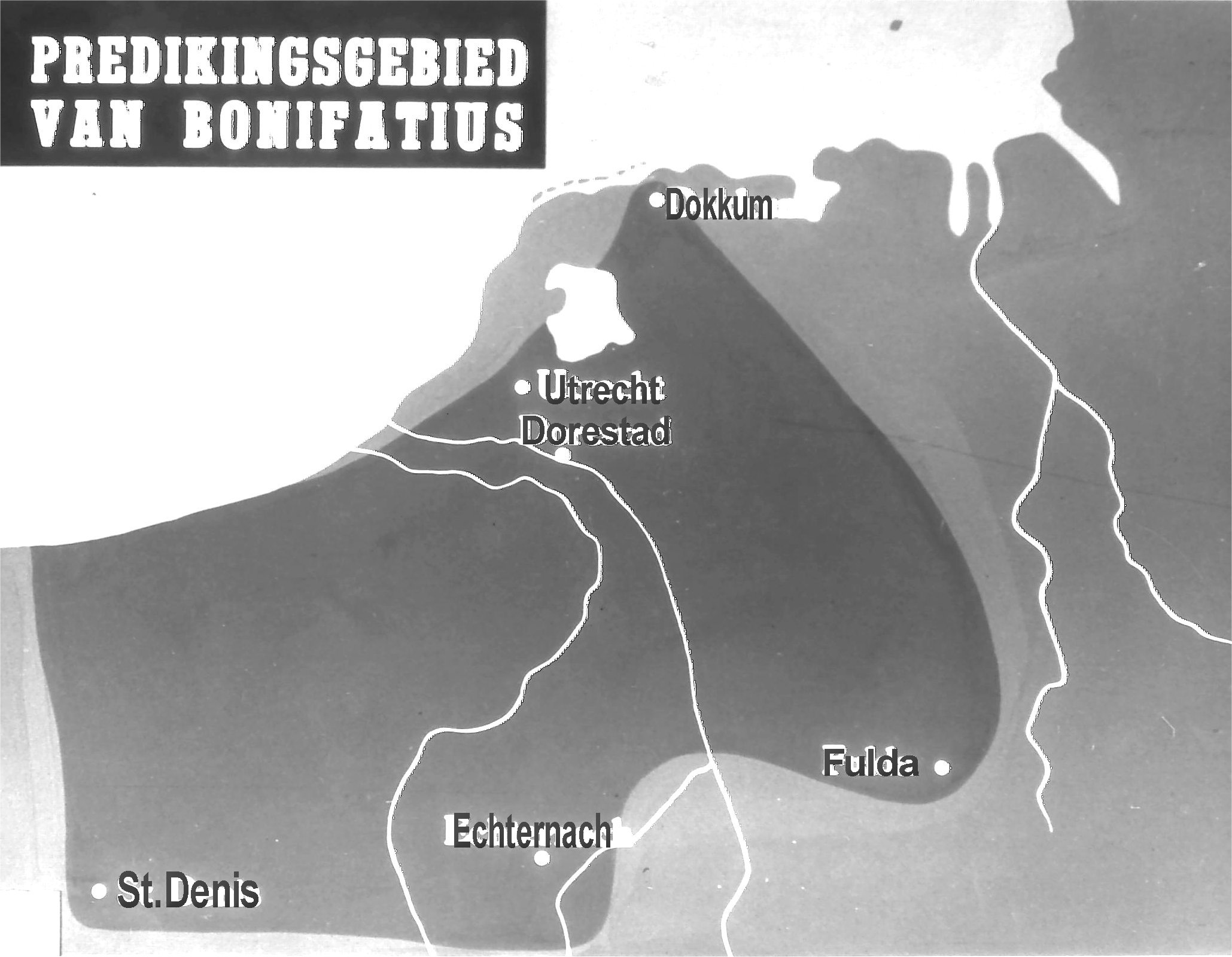 In de traditionele visie moeten we ons dus voorstellen dat Bonifatius vanuit Engeland per boot te Wijk bij Duurstede aankwam, waarna hij naar Utrecht doorreisde. Maar hij was Utrecht dan al gepasseerd. Keerde hij in Wijk bij Duurstede weer om? Maar dat staat niet in de tekst. Hij missioneerde vervolgens in Friesland ten zuiden van de Zuiderzee, eerst te Werden (in Duitsland), daarna te Nederhorst den Berg (wat volgens prof.dr.D.P.Blok Attingahem was).Links: afbeelding van de reizen die Bonifatius maakte. Afbeelding afkomstig uit 'Boniface of Devon, Apostle of Germany' by John Cyril Sladden, British Library 1980. (Eenzelfde afbeelding staat ook in 'The Greatest Englishman' by Timothyee Reuter). Klik op de kaart voor een vergroting. In die vergroting valt meteen op dat Dorstett (Dorestad waar Bonifatius aan land kwam) en Utrecht verkeerd om liggen. Dat Dorstett aan de kust lag is geheel juist, maar het was niet in Nederlad, maar in Frans-Vlaanderen. Zo maakt men mythen passend met de teksten. Wat ook opvalt is dat Bonifatius niet in Noord-Duitsland -waar de Saksen toch woonden (?)- en noord-Nederland geweest is, op die ene reis naar Dokkum na. Het jaartal 742 bij Fulda is eveneens onjuist. Lees meer over Fulda. Bonifatius was dus een 'bereisd' prediker, wat in tegenspraak is met de teksten en zijn gelofte als Benedictijn van 'stabilitas loci'. Opmerkelijk dat Frans-Vlaanderen en Noord-Frankrijk niet bij zijn missiegebied hoorde, terwijl hij Soissons Pepijn tot koning van de Franken zalfde. Ook Noord-Duitsland hoorde niet bij zijn missiegebied en Echternach wel? Klik op de afbeelding voor een vergroting. Klik hier voor een vergroting van het centrale deel van Duitsland. Alleen het centrale deel in Duitsland is al een ongekend groot missiegebied van ruim 160.000 km². Hoe intensief zal de bekering daar geweest kunnen zijn? Als Echternach bij het missiegebied van Bonifatius (als opvolger van St.Willibrord) gehoord zou hebben, dan blijft het vreemd dat Echternach geen enkel voormalig bezit van St.Bonifatius geclaimd heeft als eigendom. Ook Dokkum is nooit door Echternach geclaimd. Dat betekent slechts dat de traditie van Dokkum in de 12de eeuw nog niet bestond. Wat in de hier genoemde boekjes ontbreekt is de rol van Bonifatius in het Frankische rijk, waar hij enkele koningen zalfde en voorzitter was van het collegium van Frankische bisschoppen. Wat doet de 'Apostel van Duitsland' in Frankrijk? Volgens prof.R.R.Post was Bonifatius ook niet de opvolger van St.Willibrord (p.33). Wel kreeg hij de opdracht van Carloman een opvolger aan te wijzen, maar daarvan is geen naam bekend. Door een enkele historicus wordt wel eens de naam Dardanus genoemd, maar dat is slechts een aanname. Feit is dat zeker tot 753 de zetel van Utrecht vacant bleef, volgens Post. Dorestadum was een haven aan zee. Dat kan dus niet Wijk bij Duurstede geweest zijn? Trajectum zou Utrecht zijn. Dan vaart Bonifatius eerst Utrecht voorbij om in Wijk bij Duurstede aan land te gaan en vervolgens terug te reizen naar Utrecht, zijn 'zetelstad' maar waar hij nooit bisschop was. Deze onlogische reis geeft de onjuistheid van deze opvatting aan. In Frans-Vlaanderen is de volgorde van Dorestad (Audruiq) en Trajectum (Tournehem) wel logische en dus juist. Wyrda is in de traditionele opvatting het Duitse Werden, dat noch in Friesland, noch ten zuiden van de Zuiderzee (in de traditie het Almere) ligt. Dat in Nederland het naamkaartje "Almere" nu op een stad is geplakt, in plaats van op een zeebaai, is tekenend voor de wijze waarop men in Nederland omgaat met historische geografie. De naam Almere moet tot in lengte van jaren bewaard blijven, net als de standbeelden van Willibrord in Utrecht en Karel de Grote in Nijmegen, om de miskleunen van de Nederlandse historische-geografie op hun onkunde te blijven wijzen. In de abdij van Egmond, onder toezicht van Utrecht, werden omstreeks 1150 zomaar 26 heiligenlevens opgeschreven over de eerste predikers onder de Friezen en Saksen. Daarin wordt - en dat is natuurlijk dodelijk voor de traditie- Bonifatius niet genoemd. Daarmee staat vast dat de traditie van Bonifatius te Dokkum pas na 1150 ontstaan kan zijn en wel pas eind 16e eeuw. Het was de Franse Humanist Scaliger die bij het samenstellen van de geschiedenis van Holland eind 16e eeuw (rond 1596) Bonifatius introduceerde in Dokkum. Een klooster in Dokkum is kerkrechtelijk en archivalisch pas aantoonbaar in de 12e eeuw (gesticht in 1163). Dat is ruim 4 eeuwen na dato. Uit dat klooster zijn later alle Bonifatius-devoties gegroeid tot en met de hedendaagse VVV-reclame. De registers van de aartsbisschoppen van Mainz gaan niet verder terug dan de tiende eeuw. (Bron: J.Fr.Böhmer, Von Bonifatius bis Arnold von Selehofen, Innsbruck 1877). Ook daarin wordt Bonifatius niet genoemd, wat dodelijk is voor de traditie! Ook in de oorspronkelijke tekst van de Legenda Aurea (van de handschriften uit de vijftiende eeuw) ontbreken de typische Utrechtse heiligen als Willibrord, Bonifatius, Werenfried, Lebuinus en Plechelmus. Zij zijn pas nadien tussengevoegd.