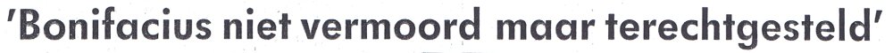 Waarom werd Bonifatius vermoord?De reden van de moord wordt in de Nederlandse traditie steeds verzwegen of onder het tapijt geveegd. Deze moord geeft precies aan dat de traditionele opvattingen onjuist zijn. Bonifatius werd vermoord, niet om geloofszaken, maar omdat hij door de Friezen gezien werd als vertegenwoordiger van het Frankisch gezag. De Friezen leefden in onmin met de Franken waartegen ze ook al enkele veldslagen gevoerd hadden. Bonifatius had Pepijn III te Soissons tot koning van de Franken gezalfd, was voorzitter van de synode van de Frankische bisschoppen en had ook de troonopvolger van de Franken (Karel de Grote) gedoopt. Hij was dus een vertegenwoordiger van het Frankisch gezag en om die reden werd hij door de Friezen vermoord. Het was dus een politiek moord en geen godsdienstige moord, ook al was de Kerk van Rome er als de kippen bij om er een godsdienstige martelaarschap van te maken. Ook op dit punt zal de geschiedenis herschreven moeten worden. Vreemd blijft dat, nu de Nederlandse Friezen zijn vrijgepleit van de vele eeuwen gedragen valse beschuldiging van een heiligschennende moord, zij daar niet eens blij om zijn. Het blijft een wonderlijke zaak dat in de tijd van toenemende ontkerkelijking, het geloof in deze predikers zo standvastig blijft, zelfs in toenemende mate wordt opgehemeld en zelfs in het NIET-Katholieke noorden zo'n vaste plaats heeft gekregen. Bonifatius was een katholiek bisschop! Het handhaven van deze gebeurtenis zal vooral ingegeven zijn door de commercie en de plaatselijke VVV's. Overigens is er met de herdenking van St.Bonifatius in Dokkum niks mis. Het waren immers hun Friese voorouders die Bonifatius vermoord hebben. Dus niet de schuld geven aan de Hollanders of de Groningers! Daarvan was toen nog geen enkele sprake. Met de emigratie van de Friezen vanuit het oude Frisia naar het Nederlandse Friesland kwam een vijftal eeuwen later de herdenking van Bonifatius tot stand. Utrecht had ondertussen Willibrordus, Deventer Lebuinus en Oldenzaal Plechelmus opgedrongen gekregen. Opgedrongen? Door wie? Door de katholieke Kerk van Rome. Immers met heiligenlevens en vereringen vielen inkomsten te verwerven dank zij aflaten en pelgrimages. Luther kwam daar in 1517 niet voor niets tegen in het verweer en stelde juist dat aan de kaak.