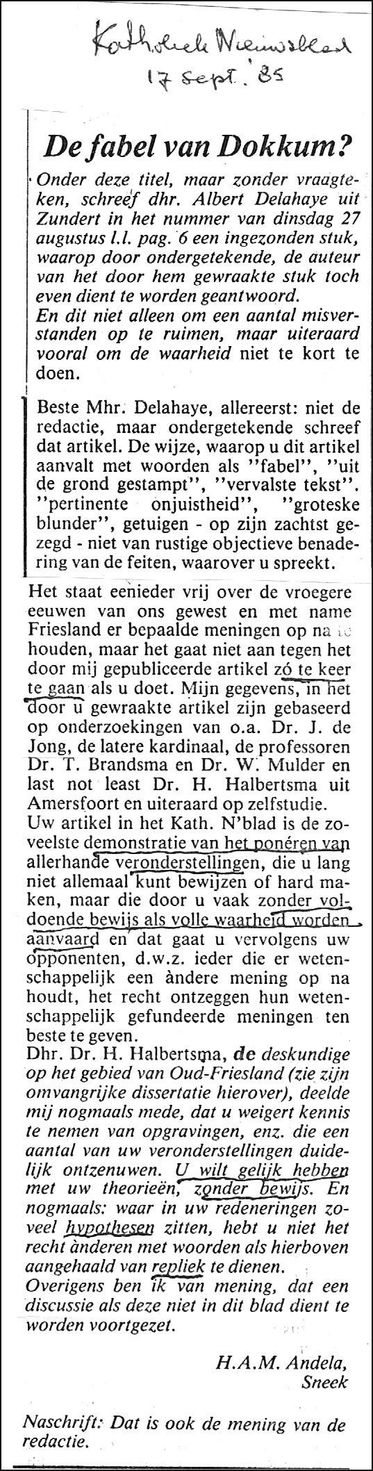 De Fresones uit het noorden van Frankrijk pleegden deze euvele daad en wel op de oever van de Bourre, zoals het in de betreffende tekst staat. De Bourre ligt in de omgeving van Hazebroek, waarvan zelfs Halbertma erkend, dat die in de buurt van Dokkum niet te vinden is en onbekend is waar dan wel. De enkeling die er de Boorn van wil maken moet toch eens een atlas aanschaffen. Onze Friezen mogen hun handen in onschuld wassen; verwacht mag worden dat zij een Beerenburg nemen op deze vrijspraak. Het deel van hen, dat zich ervoor schaamde, kan opgelucht adem halen. Het andere deel, dat er prat op gaat, moet aan het verstand gebracht worden dat het claimen van een niet gepleegd misdrijf een zware belediging is voor de hele bevolkingsgroep, tevens een zwaar vergrijp in historisch en kerkelijk opzicht. Men zou zelfs voor meineed vervolgd kunnen worden, ware het niet dat deze moord reeds lang verjaard is. Het numismatische aspect bij opgravingen in Friesland. In het Katholiek Nieuwsblad van 13 augustus 1985 houdt H.A.M.Andela uit Sneek een dissertatie over de vermeende aanwezigheid van St.Bonifatius in Dokkum. In dat artikel haalt hij enkel teksten aan waarmee hij meent te kunnen bewijzen dat Bonifatius in 754 stellig al in Dokkum zou hebben verbleven. Hij noemt teksten uit 1170, uit 1191, uit 1240, uit 1254 en uit 1558. Dat je met teksten die zich meer dan vijf eeuwen later voordoen niets bewijst over iets wat zich vijf eeuwen daarvoor zou hebben voorgedaan, begrijpt Andela niet. Daarop antwoordde Delahaye hij dat hij 'best begreep dat het Katholiek Nieuwsblad achter de mening van Andela stond', al was het maar om vooral het 'Katholieke' van de hele zaak te benadrukken. Maar met zogenaamde 'bewijzen' uit (ver-)oude(-rde) literatuur kun je niets bewijzen. In hoeverre je het als Katholiek Nieuwsblad moet opnemen voor de moordpartij, waar dan ook gepleegd, blijft een interessante vraag. Gaat het Katholiek Nieuwsblad prat op deze moord? Feitelijk is Dokkum en Bonifatius slechts een te verwaarlozen bijrolletje in het grote geheel van 'Vraagstukken in de Historische Geografie'. Het wordt toch tijd dat historici hun werk eens gaan doen en dat niet overlaten aan de plaatselijke VVV's. Het zou ook prettig zijn als lezers van de boeken van Albert Delahaye dat eens zorgvuldig gaan doen en niet voorbarige conclusies trekken, zoals V.d.Galiën (zie brief hier rechts) dat doet, die blijkbaar meer geloof hecht aan de mythe van zijn woonplaats dan aan de historische waarheid. Zie de discussie in het Katholiek Nieuwsblad van 6 aug.1985 tussen twee lezers in het kader hiernaast. Kijk bij Bonifatius, apostel van Duitsland? en bij de geschiedenis van Dokkum.