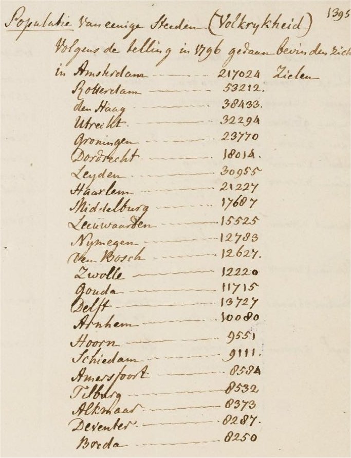 Brugge was vanaf de tiende eeuw het centrum van de (Friese) textielhandel, waardoor deze stad in de 14de eeuw al een rijke stad was met ruim 40.000 inwoners. Ter vergelijking: Rotterdam had in 1340 ongeveer 2000 inwoners. Amsterdam was begin 14de eeuw nog slechts een gehucht met zo'n 100 inwoners! Toen Amersfoort in 1259 stadsrechten kreeg van de bisschop van Utrecht, had de stad een kleine 500 à 600 inwoners. Rond 1200 telde Amersfoort 65 huizen. Het aantal inwoners berekend naar dat aantal huizen en gezinnen zal ongeveer 380 à 400 zijn geweest. In 1300 telde Amersfoort 140 huizen, met ongeveer 845 inwoners. (Bron: Bruit van d'Eem.) Amersfoort was niet meer dan een boerendorp. Tussen 1699 en 1794 telde Amersfoort zo'n 7000-8000 inwoners (Bron: Nationaal Archief: soldijboeken VOC.) In 1796 had Amersfoort volgens de Volkstelling dus 8584 (zie overzicht hiernaast). Zie afbeelding hiernaast van de 'Volkrijkheid' in 1796.Klik op de afbeelding voor een vergroting. Een studie van Bert Groenewoudt toont de geschatte bevolkingsgroei en -krimp in Nederland vanaf het jaar 0 tot 1000.In Maastricht, Nederlandse oudste stad, moet men het begin zoeken in de legerplaats die de Romeinen daar aangelegd hebben. Nijmegen, wier vroegste historie in de Romeinse tijd speelt, ligt de zaak iets minder duidelijk. Daar houdt de middeleeuwse stad, waarover men in de eeuwen die op de Romeinse tijd volgden, niets hoort, slechts indirecte verband met de Romeinse vestigingen. De koninklijke palts op het Valkhof is geenszins de voortzetting van een Romeinse vesting. De Romeinse traditie is dus in Nijmegen -niet tegenstaande de Romeinse naam Noviomagus- tamelijk zwak. (Zie opmerking hierna). Van export-nijverheid is in de vroege geschiedenis van de Nederlandse steden zo goed als geen sprake. Een der weinige uitzonderingen vormde Maastricht, waar reeds in de 13e eeuw een lakennijverheid gevestigd was die haar produkt exporteerde. De lakenexport van de Hollandse steden dateert in hoofdzaak uit de 15e eeuw. Met de vermelding van Middelburg en Kampen zijn wij reeds tot de 13e eeuw genaderd. Van sommige stadsrechtoorkonden is een origineel aanwezig, doch is de echtheid aan twijfel onderhevig, zowel ten aanzien van de datum als met betrekking tot de inhoud. In verschillende gevallen ontbreken de originele oorkonden en kennen wij de teksten slechts uit de opnieuw verlening in 1312 van de Duitse koning Hendrik VII. (Bron: prof.dr.W.Jappe Alberts, De Middeleeuwse stad.) Opmerking: Jappe Alberts gaat hier nog uit van een Karolingische palts te Nijmegen, die er echter nooit geweest is. De naam Noviomagus voor Nijmegen is een onbewezen aanname, voor het eerste gebruikt in 1145. Zie bij Nijmegen. Een tekst uit de 12e-eeuwse kroniek van Kamerijk (Frankrijk) geeft een treffend beeld van de opkomst van het Merwede-gebied in het Nederlandse rivierengebied: "Er was een plaats, door bossen en moerassen onbewoonbaar, die door inwoners Mereweda wordt genoemd, namelijk waar de rivieren Maas en Wal, een tak van de Rijn, samenkomen. Daar woonde voorheen niemand anders dan jagers en vissers. Het gebied was bij de bisschoppen van Trier en Keulen en enige abten in gemeenschappelijk bezit als vis- en jachtgebied". LET OP: het gebied in midden-Nederland was dus niet in het bezit van de bisschop van Utrecht. Deze tekst is tot in detail door de opgravingen in Wijk bij Duurstede bevestigd; de massale er aangetroffen hoeveelheden dierbeenderen en visgraten tonen dit aan, terwijl er geen enkel bewijs te voorschijn is gekomen van handelsaktiviteiten, die toch een van de voornaamste kenmerken van het antieke Dorestadum waren. De tekst is in een ander opzicht nog belangrijker. Indien ter plaatse het grote Dorestadum had gelegen, blijkens zijn raakpunten in tal van historische bronnen in geheel commercieel West-Europa, zelfs tot ver in Italië bekend, waarom heeft de kroniekschrijver van Kamerijk, die toch zo juist geïnformeerd blijkt te zijn, die stad dan niet vermeld, of meegedeeld dat en hoe zij verloren was gegaan? Hij zegt integendeel, dat de streek in zijn tijd onbewoonbaar, voorheen wel bewoond geweest was, wat exact klopt met de resultaten van de opgraving. Het beeld dat de historische bronnen over Dorestadum geven, past in Nederland van geen kant. Dorestadum was een zeer oude stad. Zij wordt voor het eerst door de Geograaf van Ravenna genoemd, die tussen 638 en 678 een Geographia samenstelde, waarschijnlijk aan kaarten ontleend. Hij vertelt in woorden en zinnen wat hij aan de hand van de kaarten meende te moeten reconstrueren. Hij schrijft: "De Renus stroomt in de Oceaan onder Dorestade in het land van de Friezen". De opgravingen bij Wijk bij Duurstede blijven waardevol, ook als men het onjuiste etiket van Dorestadum eraf haalt. Zij kunnen zelfs, als men zich eenmaal bevrijd heeft van de oude mythen en de Dorestadum-kater over is, het begin worden van een boeiend programma van archeologisch onderzoek. Want Munna, Zuuthardeshage en de meer dan 25 andere nog nooit gelocaliseerde en geïdentificeerde plaatsen, die men bij Melis Stoke en in oorkonden en goederenlijsten vindt, schreeuwen gewoon om dit onderzoek, toegespitst op de ware topografie en toponymie van Nederland. Voor de historie èn de archeologie ligt nog een groot terrein braak, gedocumenteerd in de eerste eigen Hollandse en regionale teksten. De opgravingen te Wijk bij Duurstede tonen onmiskenbaar de bewoningsgeschiedenis van de Lage Landen (les Pays-Bas aan. Er zijn 3 perioden van bewoning te onderscheiden: