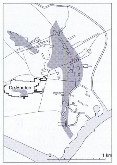 Op deze plattegrond is aan de fosfaatconcentraties (nr.2) duidelijke te zien dat dit 'Nederlandse Dorestad' geen ommuurde stad was, maar een dorp met lintbebouwing. Het was een vissersdorp waarin iedereen zo dicht mogelijk aan het water -de Rijn, waarvan de loop gewijzigd is sinds de transgressies- wilde wonen. Dat er niet langs de Lek gewoond werd geeft aanleiding te stellen dat de Lek nog niet bestond. Klik op de afbeelding voor een vergroting. Afbeelding afkomstig uit de opgravingverslagen van Van Es.