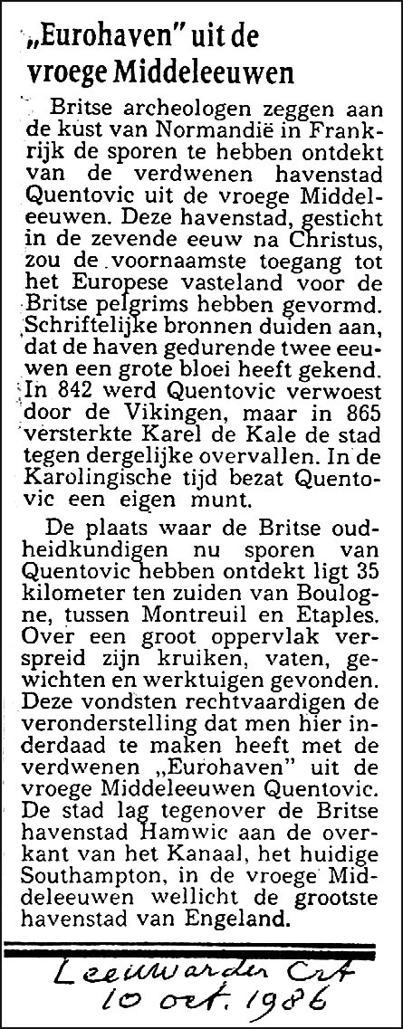 We gebruiken hier steeds de naam Dorestad voor de opgegraven nederzetting in Wijk bij Duurstede, ter voorkoming van misverstand. Het is echter een algemeen aangenomen opvatting dat deze nederzetting het beroemde Dorestad zou zijn. Het was het jagers- en vissersdorp Munna. De nederzetting bij Wijk bij Duurstede voldoet allerminst aan alle kenmerken van Dorestad, zoals beschreven in de authentieke bronnen.![]() Romeinen, Friezen en Franken in het hart van Nederland, van Trajectum tot Dorestad 50 v.Chr.-900 n.Chr. Auteurs: W.A. van Es & W.A.M. Hessing en vele anderen. (uitgever: Matrijs R.O.B. 1994) begint met een chronologische geschiedenis van het gebied, vanaf de eerste Romeinse veroveringen door Julius Caesar tot en met de tijd van Karel de Grote. Vervolgens gaan de auteurs in op bijzondere aspecten van het archeologisch onderzoek, variërend van Romeinse munten en een unieke vroeg-middeleeuwse vogelfibula tot en met de huizen en handel in Dorestad. Het boek wordt afgesloten met een overzicht van de voornaamste opgravingen, in Bunnik, Houten, Wijk bij Duurstede en Rhenen. Dit boek is het lezen, of liever het bestuderen, meer dan waard. Van Es c.s. twijfelen immers aan veel bestaande tradities of geven ronduit toe dat ze het niet weten. Die tradities blijken gebaseerd te zijn op veel aangenomen opvattingen. Dat blijkt bijvoorbeeld al uit opmerkingen als: 'we nemen aan dat', 'het is mogelijk', 'naar alle waarschijnlijkheid', 'niet helemaal duidelijk', 'niet ondenkbaar', '' naar wordt aangenomen', 'men zou kunnen denken aan', 'onze voorlopige conclusie luidt'. Het meest veelzeggend is het volgende citaat: "Voorlopig blijven dit hersenspinsels, maar geheel waardeloos zijn zij niet". (allemaal op p.32 en 33). Zoveel eerlijkheid bij Van Es c.s. geeft wel aan waar de problemen uit bestaan. Zijn tevoren gestelde opvattingen komen niet overeen -verre van zelfs- met de archeologie.