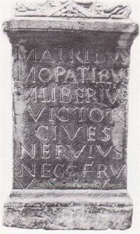 Altaar met inscriptie (in vertaling): Aan zijn moedergodinnen Mopates heeft Marcus Liberius Victor, Nerviïr, graankoopman, zijn gelofte ingelost,