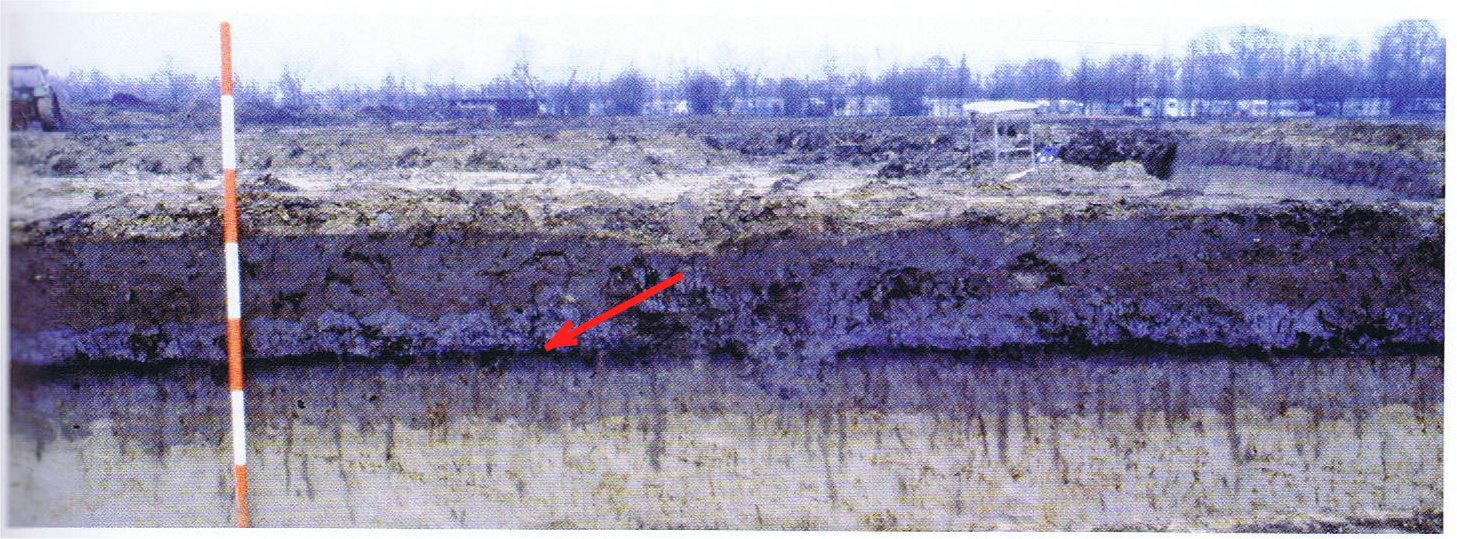 Er is geen archeoloog of historicus de de zwarte laag (zie de pijl: klik op de afbeelding voor een vergroting) wil verklaren als een brandlaag, bijvoorbeeld van de Opstand van de Bataven of als gevolg van plundering door de Noormannen. Helaas gebeurt dat wel op andere plaatsen. Het is een natuurlijke afzetting van (moeras-)planten of veenlagen. Deze afbeelding bevestigt tevens de afzettingen als gevolg van de transgressies.