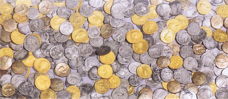 De muntvondst, bestaat uit 404 zilveren en gouden munten, onderverdeeld in drie groepen: