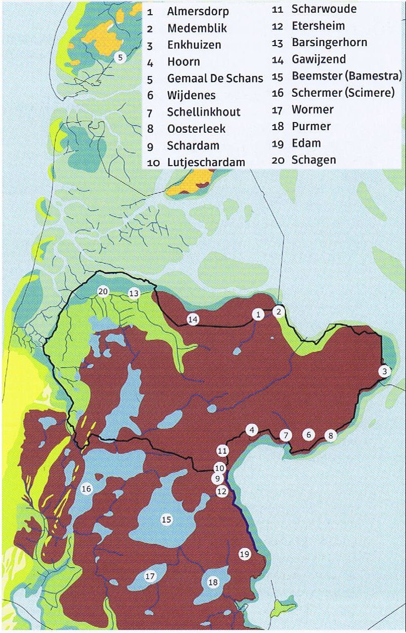 - In eerste instantie konden bestaande veenstromen tussen de omringdijken door vrij blijven afwateren op de Zuiderzee. Hierin kwam in de loop van de dertiende eeuw verandering. Door bodemdaling kwam het maaiveld onder zeeniveau te liggen. Zeewater dat nu binnendrong, zorgde voor landafslag tot ver in het veenlandschap. Zo ontstonden grote binnenmeren langs de waterlopen Bamestra (Beemster), Scimere (Schermer), Wormer en Purmer.