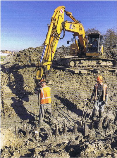 - De Romeins weg (zie foto: klik op de foto voor een vergroting) bestond naast een grintdek uit rijen paaltjes ter versteviging van de zijkanten. Die verstevigingen waren nodig vanwege de drassige bodem waarin de wegen steeds weg- en verzakten. Rond 260 ná Chr. hebben de Romeinen die talloze herstelwerkzaamheden opgegeven en 'hebben ze de boel laten gaan' zoals prof.Blok dat ooit formuleerde. Ze zijn toen uit Nederland vertrokken. Diezelfde rijen paaltjes zen we ook bij de opgravingen in Wijk bij Duurstede. Waren dat daar steigers of ook paaltjes ter versteviging van het wegdek?