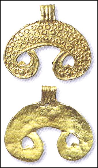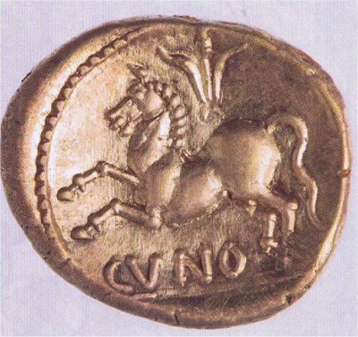 - Dat sommige zilveren munten (hiernaast een gouden Staeter van Cunobelius) bijna 250 jaar oud waren voordat ze in de grond belandden is opvallend, maar destijds niet ongewoon. Op veel van de denarii komen - naast soms graffiti - klopjes voor, zoals letters en symbolen, die na productie zijn aangebracht. Lange tijd werd hiervan gedacht dat deze verband hielden met het testen van de kwaliteit van het zilver. Nieuw onderzoek stelt hier vraagtekens bij en een nieuwe verklaring blijkt te gaan om het muntgeld te kunnen blijven gebruiken onder een nieuwe keizer. Met muntgeld is dus geen exacte datering te handhaven. Het kan ook eeuwen later verloren of verborgen zijn geweest.