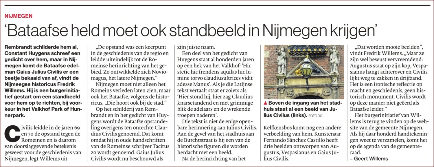 Helaas draven oude bekenden, waarvan men mocht hopen, dat ze toch eindelijk uit onze literatuur verdwenen waren, weer vrolijk op, zoals de Batavieren en "onze eigen" Claudius Civilis, zelfs vergezeld van "zijn broer Julius Civilis". Bron: Westerheem. (Afbeelding bovenaan de pagina uit de Katholieke Illustratie van 26 febr.1966.)De hele geschiedenis van Romeins Nederland en vooral die van Romeins Nijmegen is gebaseerd op de aanwezigheid van de Bataven in de Betuwe. Dat de Betuwe ooit 'het eiland van de Bataven" is geweest is reeds lang weerlegd en wel met de volgende feiten: