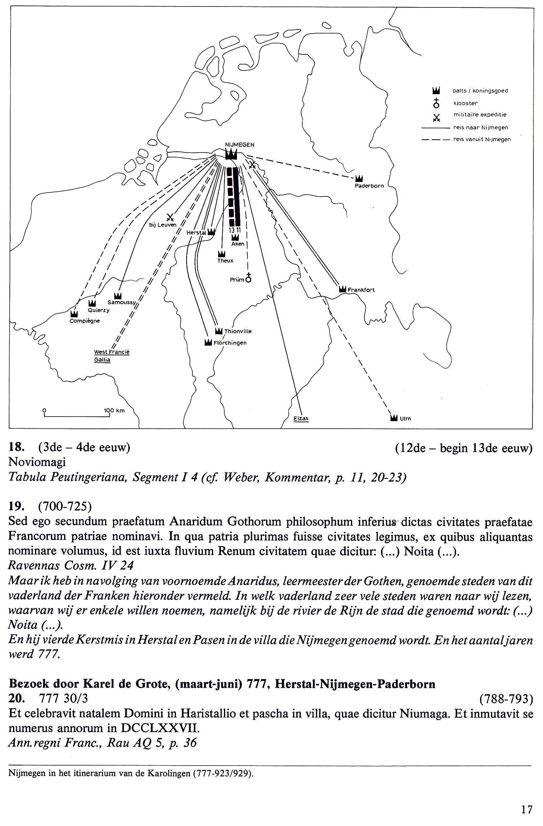 Over de tekst van de Annales Regni Francorum (tekst 20) wordt vermeld dat de keizer Kerstmis vierde in Herstal en Pasen in de villa die Nijmegen genoemd wordt. En het aantal jaren werd 777.