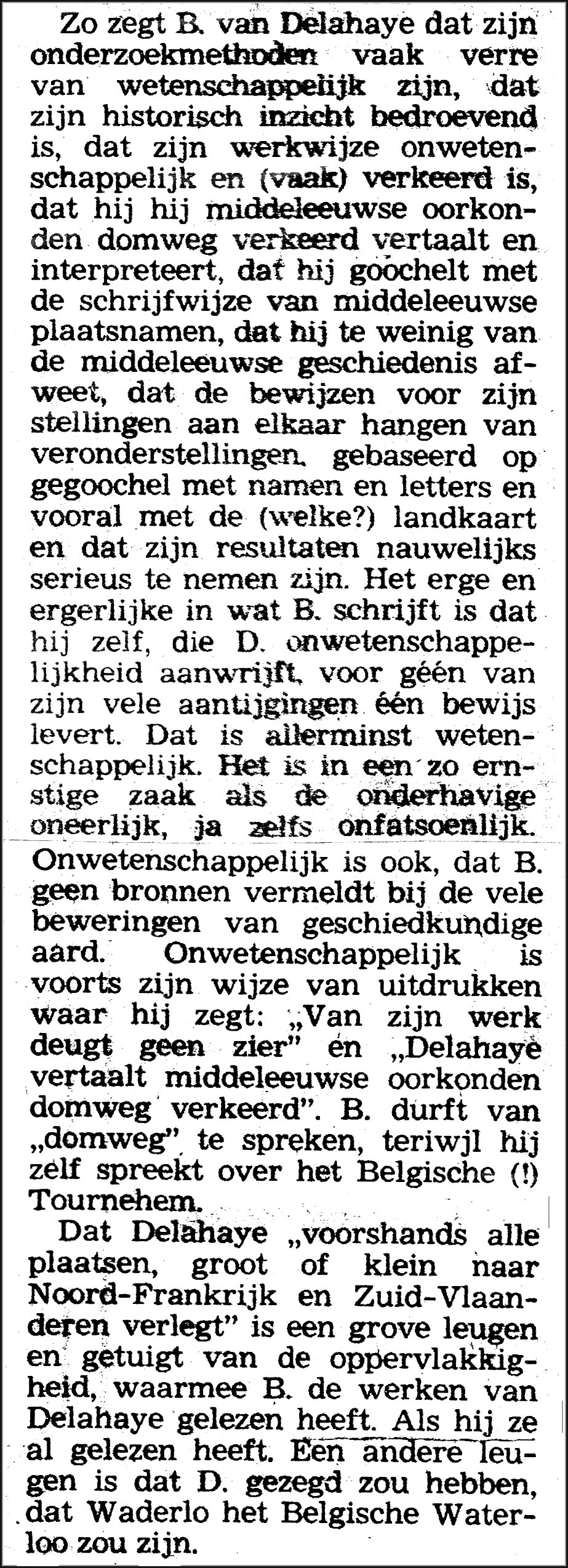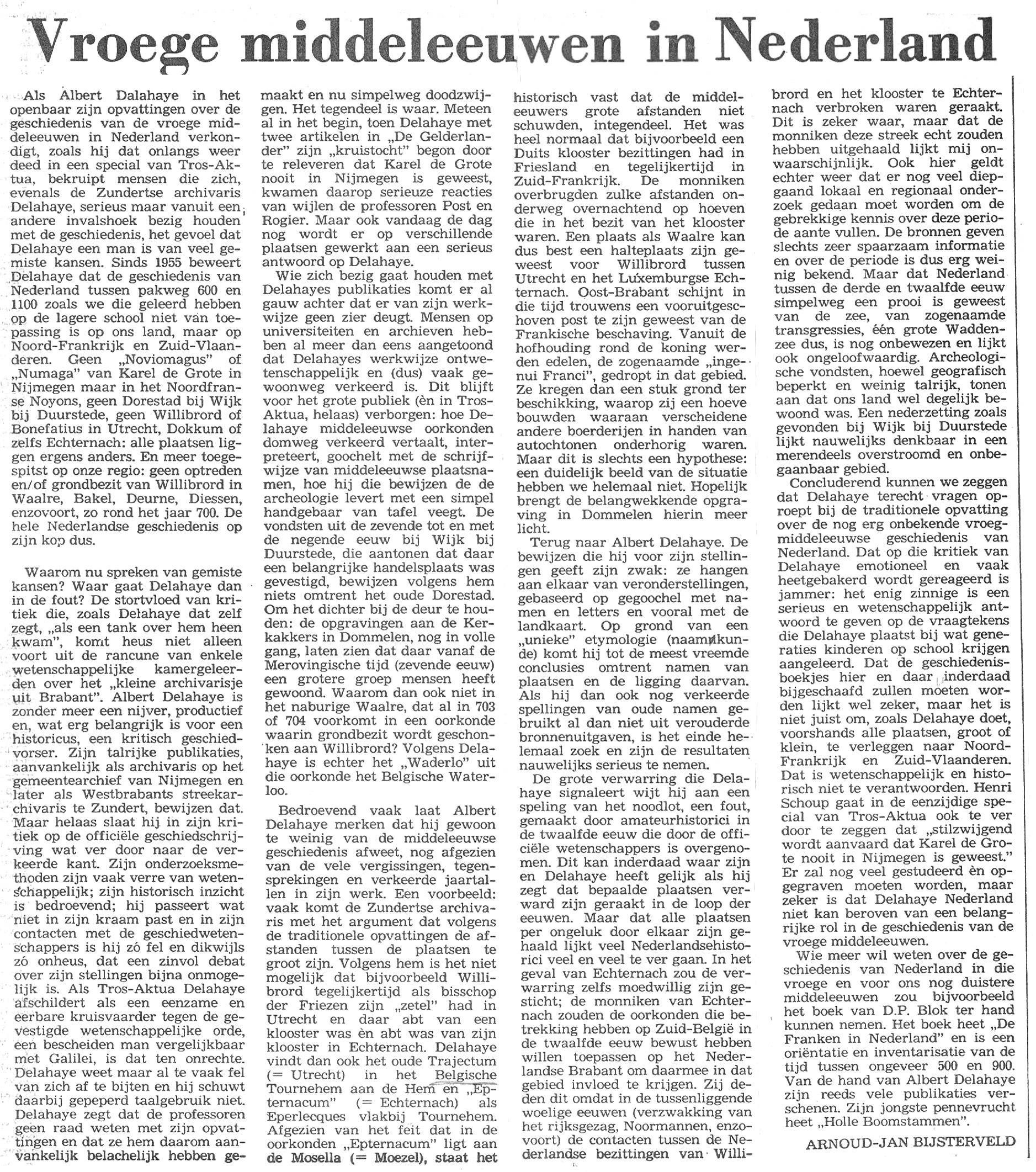 Het is onbegrijpelijk dat mensen die daarvoor hebben doorgeleerd, blijven vasthouden aan eenmaal aangenomen maar nooit bewezen oude opvattingen. Zo iemand is (was?) ook Arnoud-Jan Bijsterveld (*Waalre, 8 mrt.1962). Bijsterveld is (nee, was!? lees verder) de 'grote verdediger' van de traditie van Willibrord in Waalre (uiteraard laat je je eigen dorp niet vallen) en Valkenswaard. In 1981 (net 19 jaar!) meende hij al verstand te hebben van middeleeuwse geschiedenis en het lezen en vooral het begrijpen van oude klassieke handschriften en teksten. Dat hij daarbij hopeloos in de fout ging mag blijken uit het feit dat hij Tournehem in België plaatst (het ligt toch echt in Frankrijk) en meende dat Delahaye met Wattrelos wel Waterloo in hetzelfde België zou bedoelen. Blijkbaar ging zijn gezichtsveld vanuit Brabant niet verder dan net over de grens. In Brabants Heem (1983) herhaalde hij een aantal van die stellingen (zie bij stellingen van Bijsterveld), maar op een lezing op 25 oktober 1989 had hij plots een geheel andere opvatting. Zie het knipsel hieronder uit het verslag van die lezing. Vergelijk eens wat Bijsterveld in 1983 schrijft met wat hij in 1989 uitsprak. In die zes jaar zijn z'n ogen blijkbaar geopend en heeft hij van de complexe materie eindelijk iets begrepen. En dan in 2000 had hij het eindelijk bijna (?) helemaal begrepen. Zie verder naar onderen. ![]() Wat Delahaye ten aanzien van Willibrord en andere predikers ontdekte, had Bijsterveld al vanaf zijn studietijd kunnen weten, tenminste, als hij dit boek van Post eens gelezen had. Stond dat niet op de literatuurlijst van de Universiteit? Post was docent aan de Universiteit van Nijmegen. Zou men dit boek niet meer kennen? Leupen, de auteur van het Bronnenboek kende het ook niet, tenminste, het staat niet in de literatuurlijst van dat Bronnenboek. Of zou Leupen het opzettelijk achterwege gelaten hebben, omdat het een aantal van zijn opvattingen tegenspreekt? Van zoveel achterdocht kun je bijna niet uitgaan, hoewel, in de historische wereld hoef je je nergens over te verbazen als het op 'reputaties' aankomt. Het is voor Bijsterveld zeker aan te raden dit boek van prof.dr.R.R.Post eens zorgvuldig te lezen, of liever, te bestuderen. Post spreekt op meerdere cruciale punten de Willibrord-mythe in Nederland tegen. Post stelde dat 'Willibrord geen bisschop van Utrecht geweest kan zijn' en in een discussie met enkele vakgenoten wees Post 'het verblijf van St.Willibrord in Noord-Brabant resoluut van de hand'. Voor dat verblijf van Willibrord in Brabant was geen enkel bewijs te vinden. En als Willibrord verdwijnt uit Utrecht, is dat uiteraard pijnlijk voor Bijsterveld van wie juist het verblijf van Willibrord in Noord-Brabant zijn stokpaardje is. Maar het tij is gekeerd. Bijsterveld is om en erkent het gelijk van Delahaye: lees hieronder daar alles over! ![]() Bijsterveld geeft hier feilloos aan wanneer de St.Willibrord-cultus in Brabant is ontstaan en kerken hun patroon kregen, namelijk in de 16de en 17de eeuw. Dat is duidelijke taal, waarmee hij al zijn eerdere opvattingen radicaal tegenspreekt Maar ook dit is niet helemaal juist of helemaal niet juist. Immers de oudste kerken met het patronaat van St.Willibrord stammen uit de 12de eeuw, namelijk Klein-Zundert (1157) en Alphen (1175), beiden gesticht vanuit Tongerlo in België. En nu we het toch over België hebben noemen we nog eens Waterloo waar Bijsterveld onjuist Wattrelos plaatst. Hier vindt ook Bijsterveld zijn Waterloo'. Waterloo is óverigens een 'spiegelwoord' dat (op de taalgrens!) samengesteld is uit water en l'eau, ofwel uit 2 woorden met dezelfde betekenis. Deze etymologie vind je ook niet terug bij Gysseling, die alles zo goed wist. Bij hem is 'loo' altijd een bos, zelfs op de taalgrens. Dat zou hij als Belg toch beter hebben moeten weten. ![]() ![]() In het artikel uit 1981 kwam de nog geen 20-jarige Bijsterveld met enkele opvallenden quotes, waarin hij Albert Delahaye belachelijk wilde maken en een beetje revanche wilde nemen voor wat Delahaye in de Ware Kijk Op over hem geschreven had. Het ging toen over de redactie van Brabants Heem die vond dat Delahaye "op alle punten van kritiek van Bijsterveld moest antwoorden". Daarop schreef Delahaye "dat had ik al in “Vraagstukken...” van 1965/66 gedaan, toen Bijsterveld nog een kleuter was, maar dit boek heeft hij niet gezien omdat het in Nijmegen en Brabant verboden lektuur is". Daarop volgde in 1981 dus enkele erg 'wetenschappelijke' en 'goed doordachte' uitspraken van Bijsterveld, zoals: ![]() ![]() Is dat de wetenschappelijke taktiek? Eerst iemand de hemel inprijzen en vervolgens compleet afbranden? Blijkbaar kon Bijsterveld dat als 19 jarige student al prima beoordelen. Of praatte hij zijn leermeester Leupen slechts na? Zo werkt dat blijkbaar in historisch Nederland: vooral niet je leermeester afvallen, immers doe je dat wel, dan blijk je alles verkeerd te hebben geleerd. Zelf nadenken is er niet bij! Bijsterveld meende toch wel dat Delahaye een kritische geschiedvorser was. Blijkbaar te kritisch. Immers Delahaye slikte niet alles als zoete koek, maar ging zelf op onderzoek uit naar de bewijzen. En die bleken er niet te zijn. ![]() Op welke plaatsen vandaag de dag nog gewerkt wordt aan een serieus antwoord op Delahaye blijft een vraag. serieuze antwoorden heeft Delahaye zelf nooit mogen ontvangen. Blijkbaar valt het niet mee om kort en bondig een serieus antwoord te geven. Is de materie ook voor historici te complex? ![]() Dat ene voorbeeld geef ik hem dan wel: Kroniekschrijver Flodoard deelt in het jaar 925 het volgende mede: "De Noormannen komen uit Rouen en Péronne en plunderen eerst Beauvais, daarna Amiens en Arras. Toen verschenen ze voor het Paleis van Noviomagus dat ze ook plunderden." Nu mag Bijsterveld uitmaken of met Noviomagus Nijmegen of Noyon (dat in dezelfde streek ligt) bedoeld is. Is de conclusie van Delahaye die voor Noyon kiest zwak? Is het gegoochel met etymologie en plaatsnamen als je Noyon Noviomagus