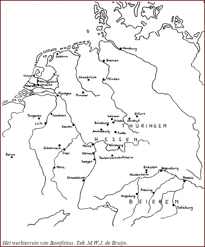 De visie van Albert Delahaye. ![]() Het werkterrein van Bonifatius, zoals Martin de Bruijn het voorstelt. Klik op de afbeelding voor een vergroting. Het is helaas een onjuiste voorstelling, wat ook niet anders kan als je Turingia opvat als Thüringen, Bagiorenses of Bajowaria als Beieren opvat en Hetti of Hettuarii als Hessen. Het waren achtereenvolgend het land van Doornik, van Bavay en van Ath. In Frisia noemt De Bruijn maar één plaats: Dokkum, wat Duinkerke moet zijn dat immers het ware Dockynchirica was, waar ook het ware Frisia lag. Opvallend is ook dat De Bruijn Dorestad en Aken niet noemt, wel Attingahem dat bij hem Breukelen is. Bij prof.D.P. Blok is het echter (zijn woonplaats) Nederhorst de Berg. Daarover merkte Albert Delahye eens op: "als je zo wat plaatsen aan het uitdelen bent, kun je je eigen woonplaats toch niet overslaan?" Opvallend is ook dat Nijmegen bij hem aan de Rijn ligt, wat volkomen onjuist is. Fulda staat ook op dit kaartje, terwijl Fulda in de tijd van Bonifatius nog niet bestond. De grootste misvatting is dat het werkterrein van Bonifatius zo erg omvangrijk wordt afgebeeld, terwijl hij een Benedictijn was en slechts kleine bisdommen maakte. En waar plaats De Brruijn alle activiteiten van Bonifatius in relatie met de Frankische bisschoppen en de Karolingen? Immers Bonifatius heeft Frankische koningen gezalfd en gekroond en koningskinderen, zoals Karel de Grote, gedoopt. Ook was hij voorzitter van het consilium van Frankische bisschoppen. Dat was voor de Friezen ook de reden hem te vermoorden: Bonifatius werd gezien als een vertegenwoordiger van het Frankische gezag. En dan toch groot nieuws. In het boek "Bonifatius en de kerk van Nederland" lezen we toch een aantal opvallende zaken.