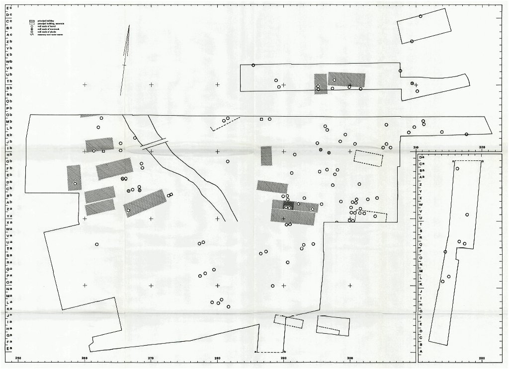 Het ontbreken van woningen in de zuidelijke helft van het plan in figuur 7 komt overeen met de werkelijke situatie. Geen huizen stonden in het zuidwestelijke deel van het opgegraven gebied (vierkanten Ea/Va-255/275), noch waren er grote gebouwen op pleinen Ga/Wa-275/295. De huizen aangegeven in vierkanten Ga/Ja-298/300 zijn onzeker (p.194). Zie de vorige opmerking.