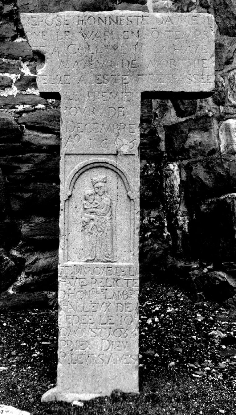 Volgens haar grafkruis heette de vrouw van Colleye delle Haye: Maroye le Wael, en is zij overleden op 1 december 1605. Haar (gedeeltelijk gebroken) grafkruis voor moeder en dochter (zie afbeelding hiernaast) bevindt zich vlak naast de ingang van de kerk van Mortier. Het draagt de volgende inscriptie [verdwenen tekst]: