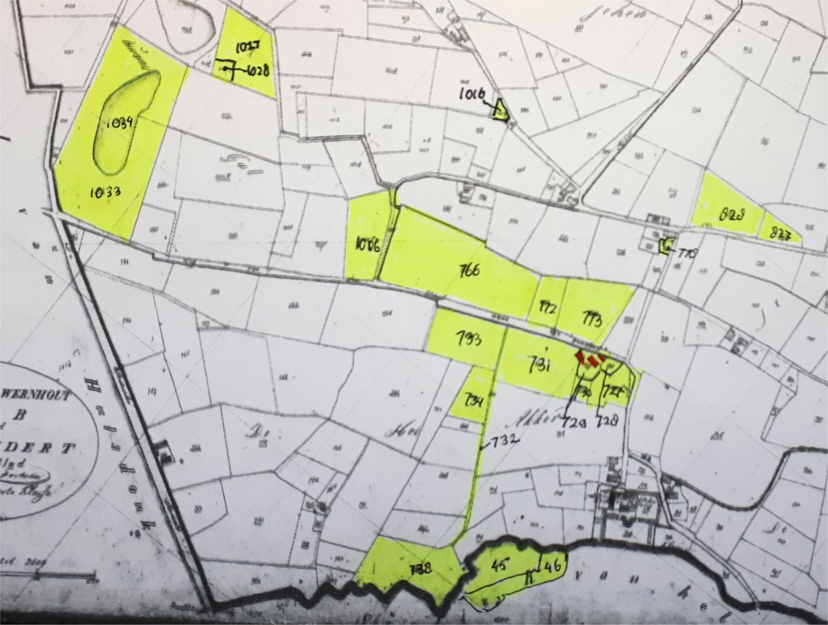 de geel gekleurde percelen waren in bezit van de familie Pellis-Vriends-De Bruijn).