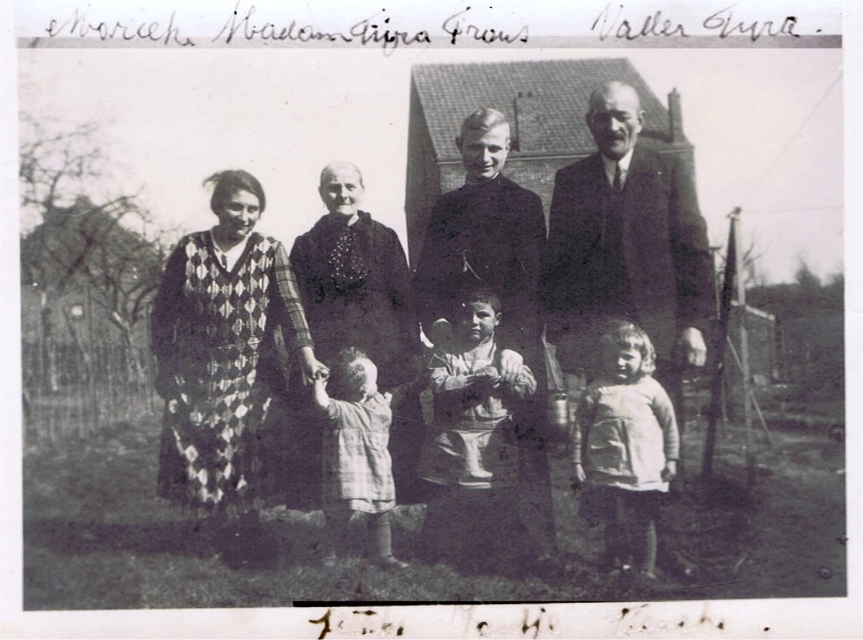 20 Maart 1936. Feest van Professie van Broeder Frans Tyra/Tura. Vader en moeder van Frans bij ons gelogeerd eigen gemaakte foto achter ons huis. Verder Marieke, Jantje, Tieneke en Jetteke.