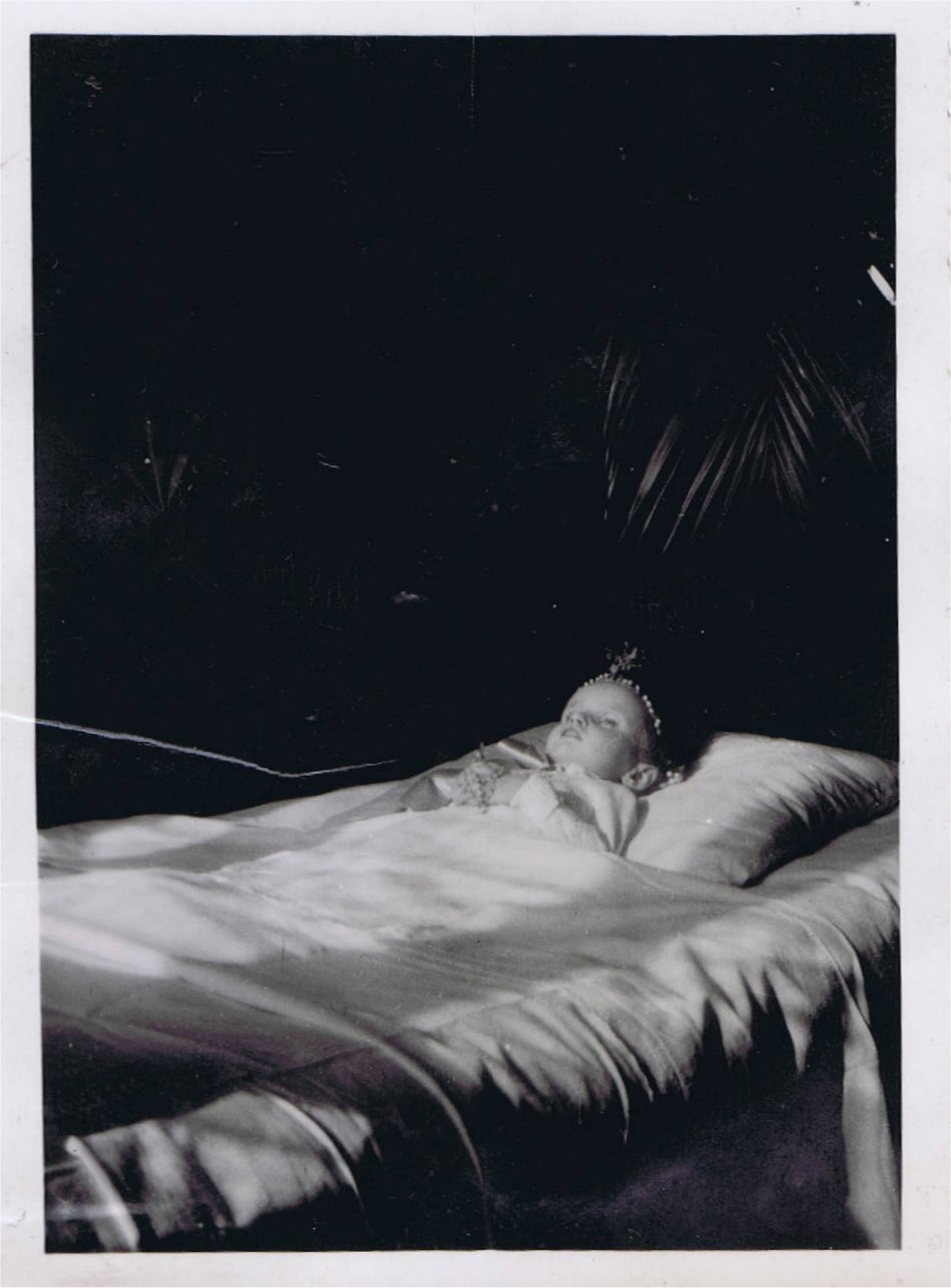 Het derde kind van het gezin Bos-Wauters was Jeannet (Antoinette Maria Elisabeth). Zij overleed op 1nov.1936, 2 jaar oud. Op de foto ligt zij opgebaard. Opvallend is dat zij op de overlijdensadvertentie van vader uit 1990 ontbreekt, op die van moeder uit 1995, die ook op 1 november overleed, wordt zij wel genoemd.