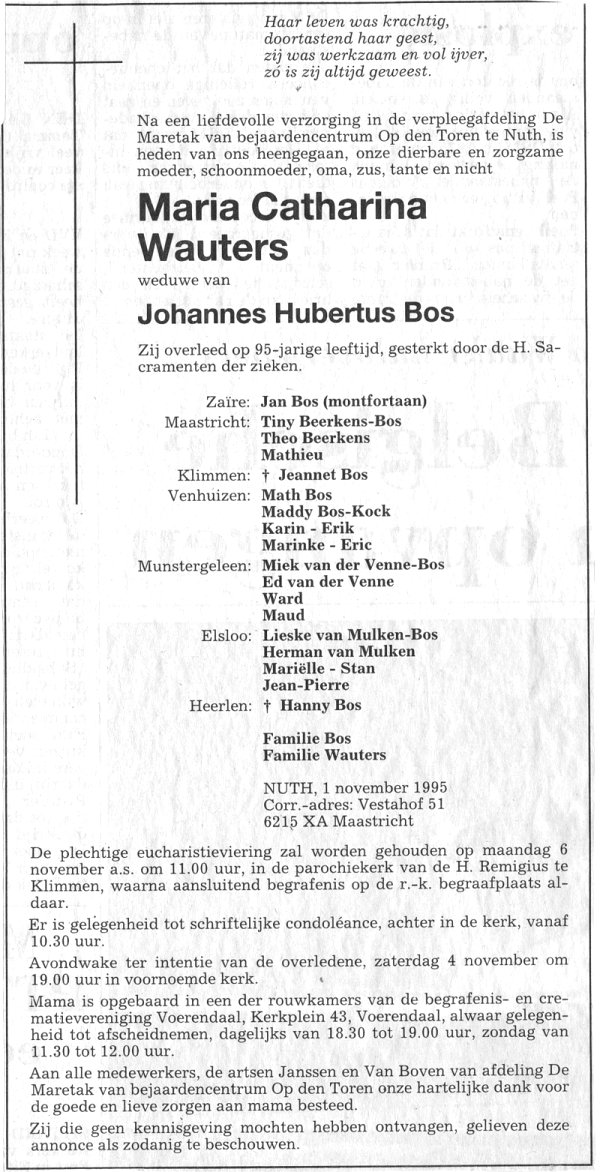 Johannes trouwde op 14 febr.1931 met Maria Catharina Wauters (Meerssen 13-6-1900, Nuth 1-11-1995). Zij kregen 7 kinderen waarvan pater Jan Bos de oudste was. Jan Bos was een achterneef van de Delahaije's uit Klimmen (geboren 1932) en was Montfortaan, net als Heeroom Jozef Delahaije. In 1959 is hij priester gewijd. Zie de foto's hieronder. Zie over de familie Bos-Wauters: Herten VIB p. 94.