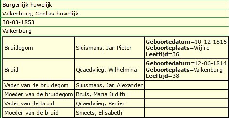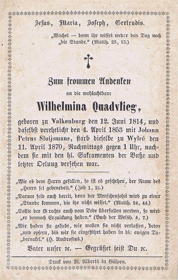 ![]() Bidprentje van Wilhelmina Quadvlieg. | ![]() Bidprentje Wilhelmina Quadvlieg, achterkant. | ![]() Huwelijksaangifte van Jan Pieter Sluismans en Wilhelmina Quaedvlieg. |