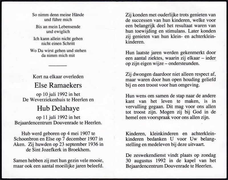 Bidprentje van Hub Delahaye en Else Ramaekers, die een dag na elkaar overleden.