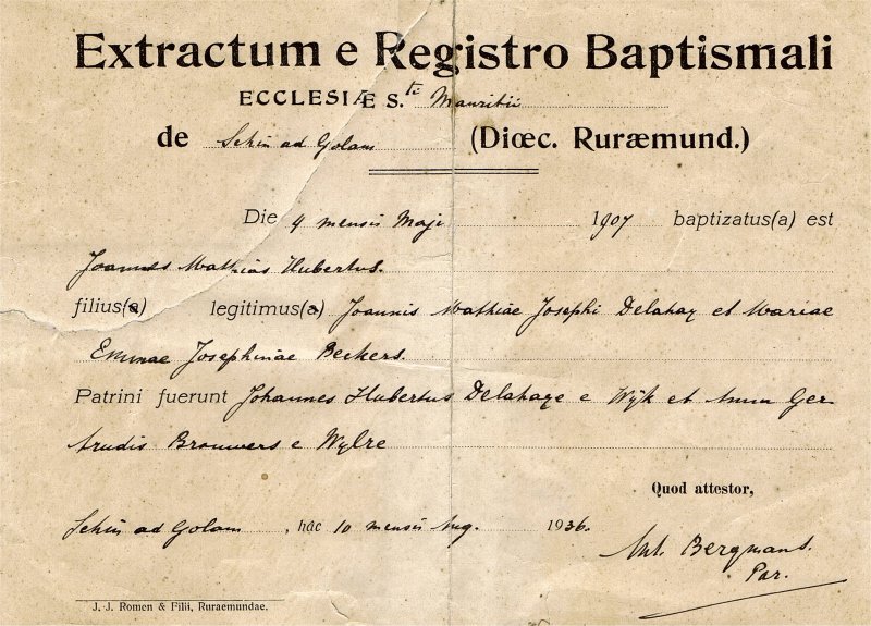 Hub Delahaije (als eerste kind) is in Tilleur (België) naar school gegaan. Volgens opgave van vader alleen in 1919 en 1920. Blijkbaar woonde hij in bij Oom Hubert Beckers. Later erft hij de 'six dictionnaires Larousse' van ome Hubert. Ome Hubert was niet zijn peetoom (zie opgave hierboven). Toen Hub 5 jaar was, waren er in het gezin Delahaije-Beckers al 6 kinderen. Het 4e kindje Louise overleed op 4 aug.1912. Moeder was al snel daarna in verwachting van haar 7e kind. Begrijpelijk dat wel eens een kind uitbesteed werd.