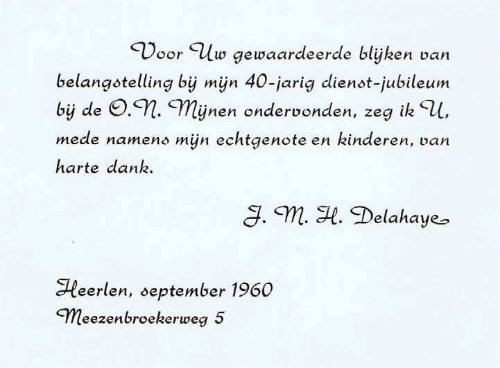 Hij heeft bij de Mijnen tot aan zijn pensionering gewerkt. In 1960 vierde hij het 40-jarig dienstverband bij de Oranje Nassau Mijnen. Zie afbeelding hieronder.