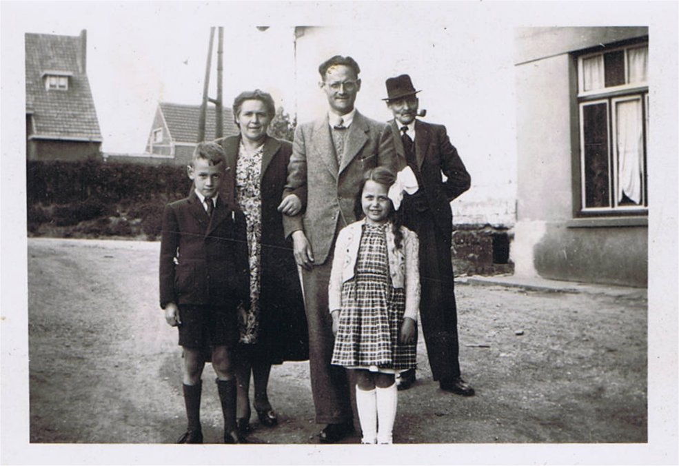 Hub en Else met hun kinderen Jo en Emmy op bezoek bij Opa en Oma in Klimmen, ca.1945. Deze foto is gemaakt in dezelfde tijd als de foto van Opa en Oma voor hun huis. Zie foto album 1965 De ramen zijn nog dichtgemaakt met een plank. Is deze foto gemaakt door Oma omdat zij er niet opstaat?