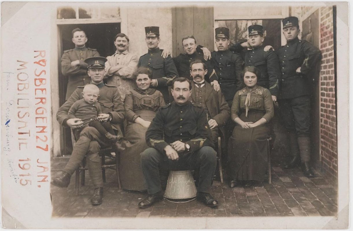 Rijsbergen: Mobilisatie 1915. Achter de woning van bakker Douenburg poseerde dit gezelschap. In het midden bakker Douenburg, links (voor de kijker) naast hem zijn vrouw Cornelia van Achtmaal en rechts Keeke Mathijssen. Links zittend op schoot van een officier Jos C.M.A Douenburg. Op de emmer vooraan zit sergeant Mathieu Koene uit Maastricht (1e compagnie III Bataljon 13 Regiment Infanterie) die de maker van deze (en andere) foto ('s) is.