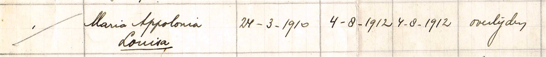 Lowiske is 2 jaar en 4 maanden geworden. Toen zij op 4 augustus 1912 overleed, bestond het gezin Delahaije-Beckers uit 6 kinderen. De zesde, Math, was geboren op 12 mei en was toen 4 maanden. De andere kinderen waren Hub (5 jaar), Jozef (4), May (3) en Jan (1 jaar). Tussen 1907 en 1915 werd er elk jaar een kind geboren. Daarna volgden de geboortejaren 1917, 1918, 1920, 1921, 1924 en 1926. In totaal werden er 15 kinderen geboren in dit gezin. Een 'goed katholiek' gezin dus, waarvan liefst 10 kinderen de (doop-)naam Maria ontvingen en een van de oudste zonen priester werd. De pastoor en de kerk zullen het tot tevredenheid hebben aanschouwd.