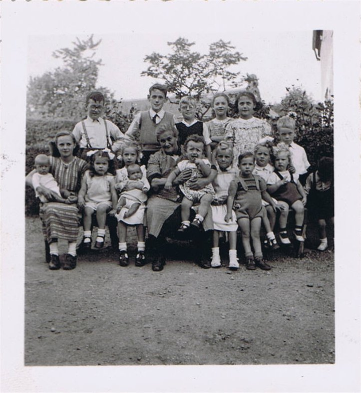 |  In 1949 werd een foto gemaakt van Oma met haar 17 (toen aanwezige) kleinkinderen. Een kleinkind, helemaal rechts, lette even niet op. Eind 1949 had Oma al 29 kleinkinderen. In de jaren 50 en 60 zouden er nog 23 kleinkinderen bijkomen. Het totaal kwam daarmee op 52 kleinkinderen.
