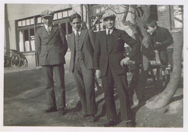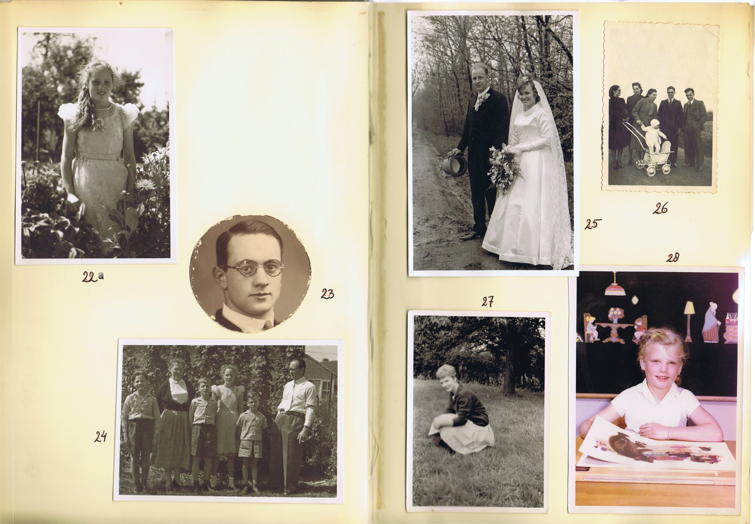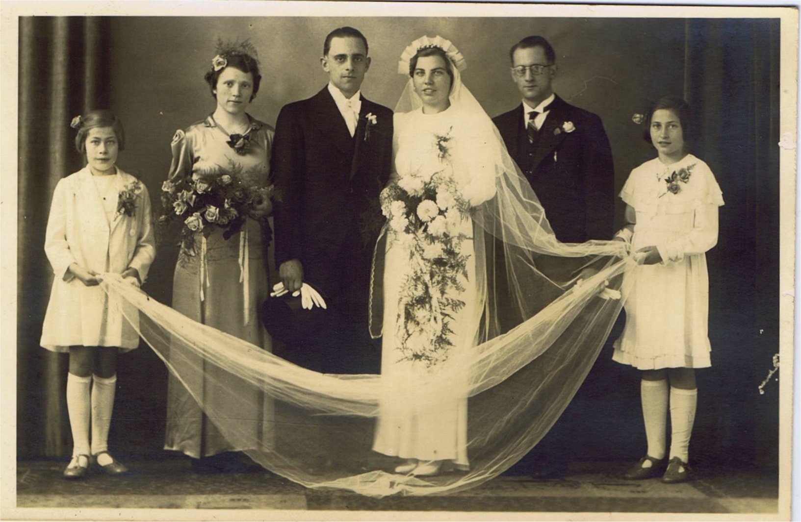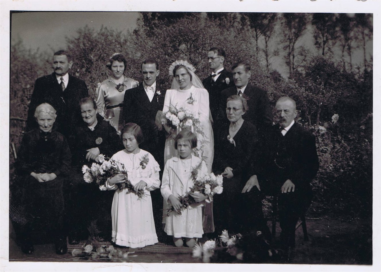|  Huwelijks Math en Käthe op 18-10-1938. Op de achterzijde van deze foto staat: "De twee oude menschen zijn Käthe haar grootouders". Deze zitten geheel links en rechts. Links en recht van het bruidspaar hun ouders.