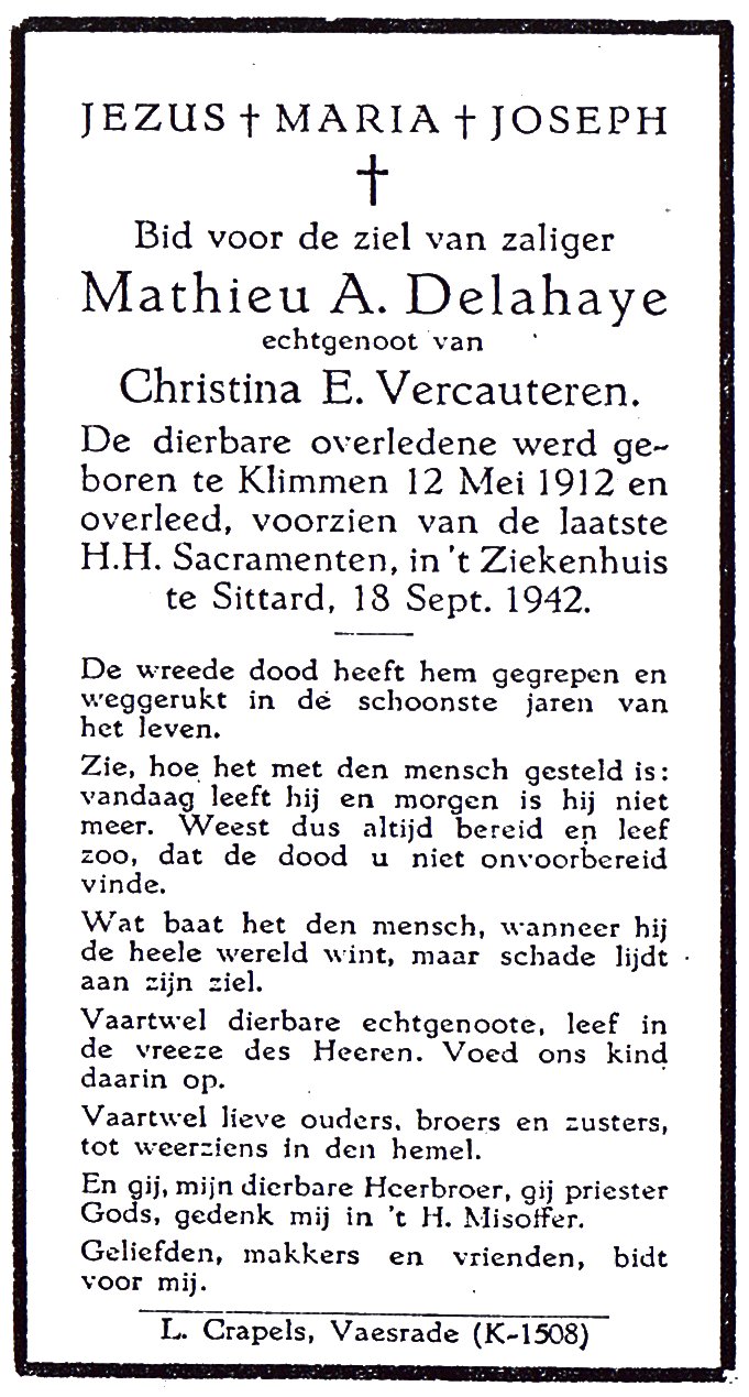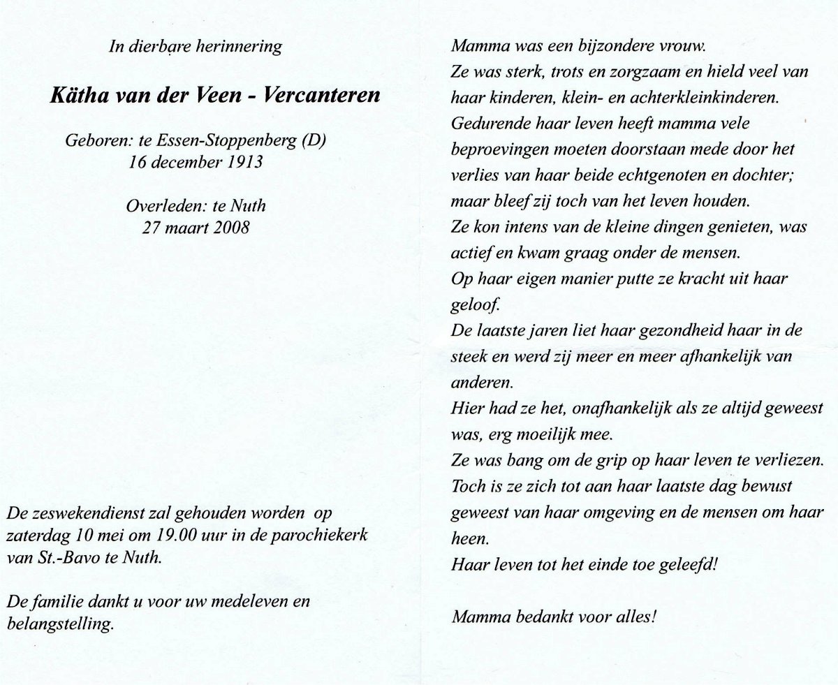 | Op het bidprentje staat haar naam gespeld als Vercanteren, terwijl in de genealogie Vercauteren staat. Ook wordt ze hier Kätha genoemd. elders Käthe.