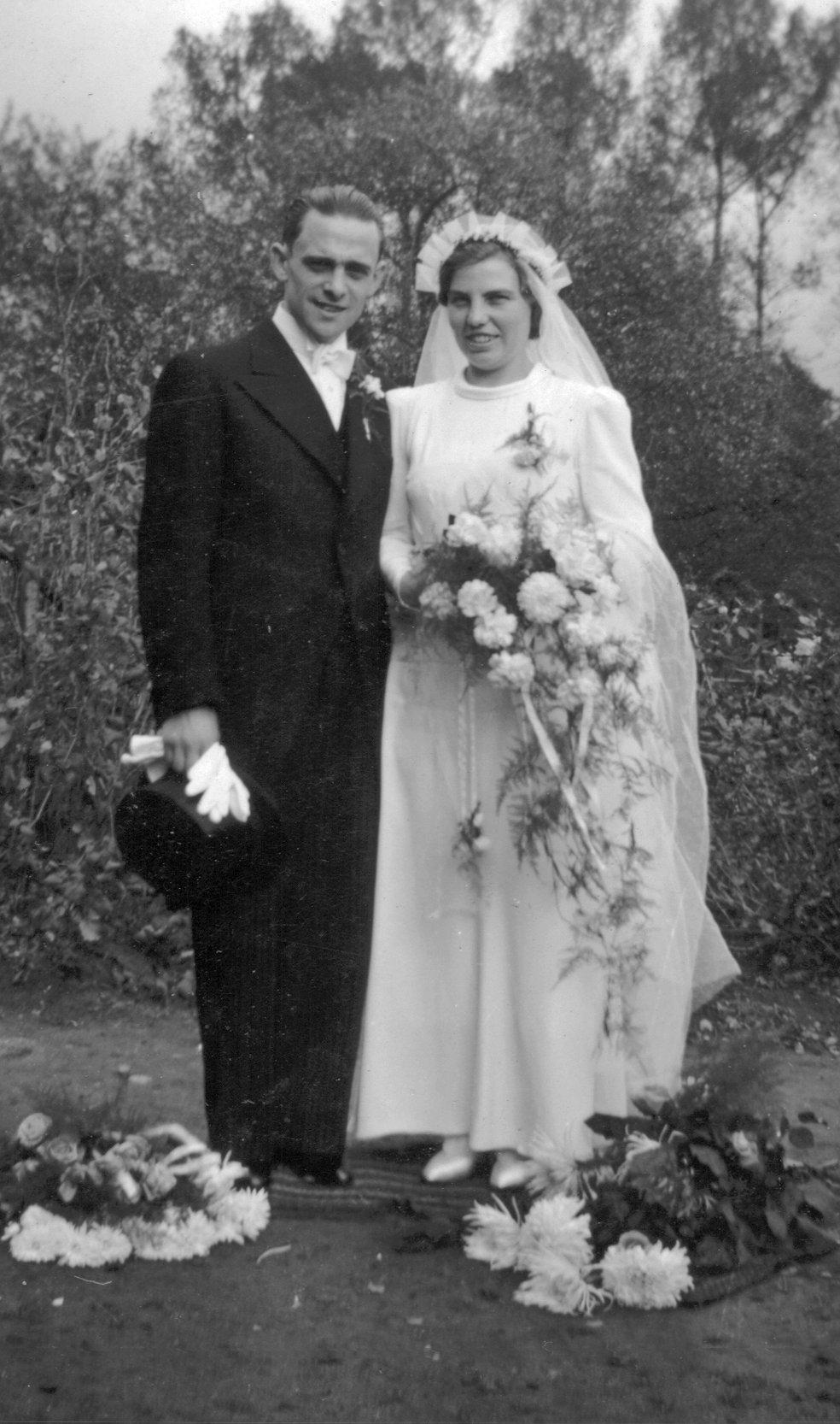 Huwelijks statiefoto van Math en Käthe. Getuige rechts: broer Jan (rechts).