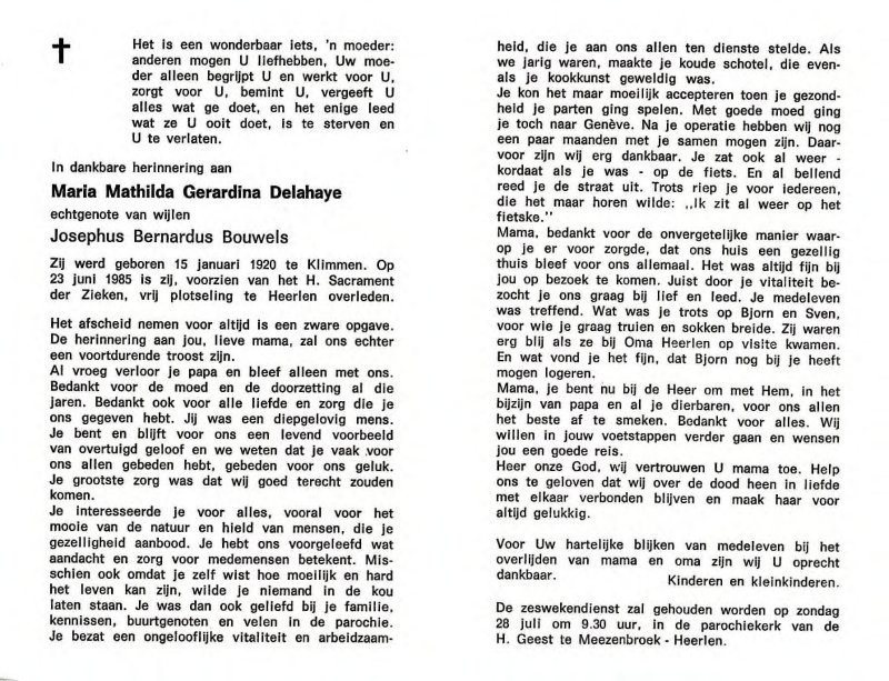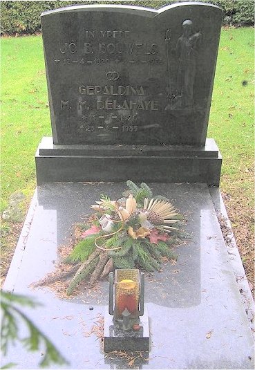 ![]() Bidprentje van Geraldina Delahaye, voorzijde. | ![]() Bidprentje van Geraldine Bouwels-Delahaye. | ![]() 1985 Heerlen, Graf Jo Bouwels en Geraldina Delahaije. | ![]() Bidprentje Jo Bouwels. |