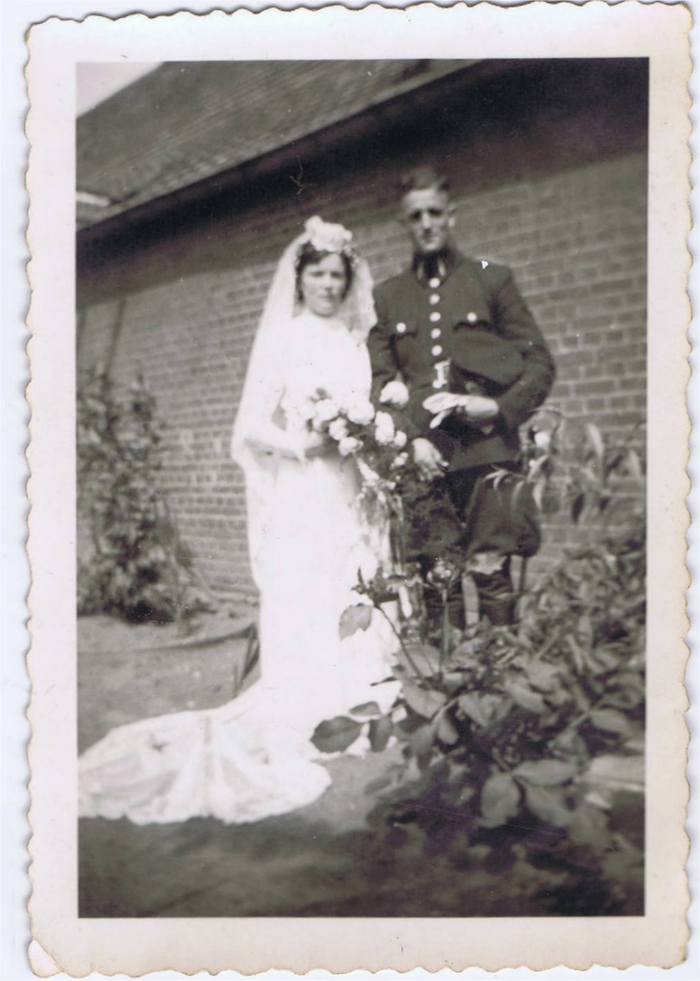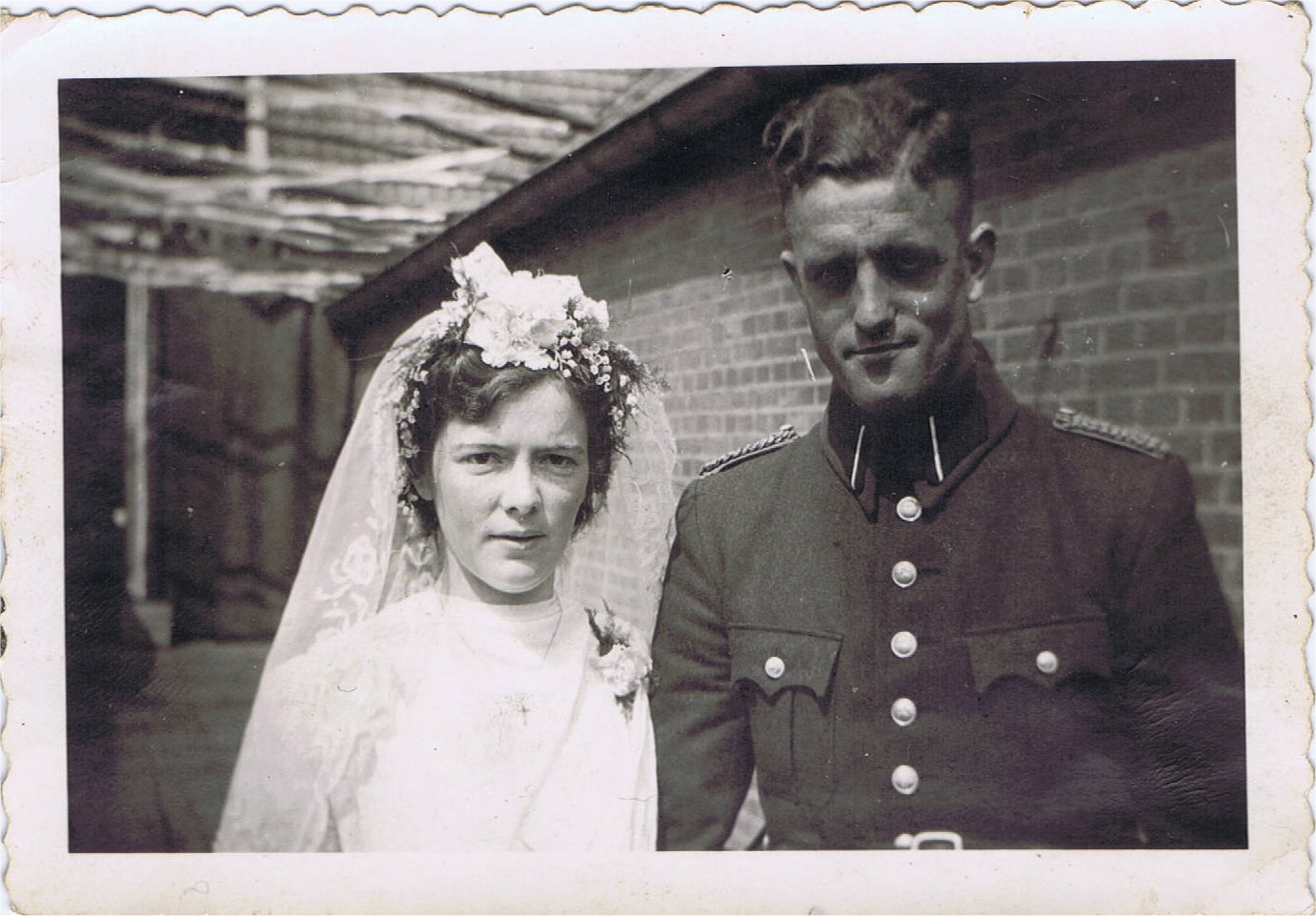 ![]() Sjir in 'het eerste grijs'. | ![]() Sjir in de film op You Tube. Na 58 sec. zie je hem onder de ereboog lopen. Klik hier voor het bekijken van de film.. | ![]() De statie huwelijksfoto. | Mia Pijpers. Maria Gertruda Theodora Catharina (Mia) Delahaye (geboren Pijpers), 1924 - 1946. Mia Pijpers is geboren te Venray op 24-2-1924, dochter van Antonius Gerardus (Toon) Pijpers en Bernardina Mathilde Theodora (Dina) Pijpers (geboren Janssen). Toon Pijpers is geboren op 3 april 1896, in Blitterswijck. Dina Janssen is geboren op 28 juli 1899, in Venray. Mia had 6 broers/zussen: Johannus Theodorus Gerardus (Jo) Pijpers en 5 andere broers of zussen. Mia trouwde met Gerardus Hendricus (Sjir) Delahaye op 19 juli 1944, op 20 jarige leeftijd in Klimmen. Gerardus is geboren op 11 maart 1918, in Klimmen. Mia is overleden te Gennep op 31 jan. 1946, op 21 jarige leeftijd. (Info van My Heritage, aangevuld met eigen gegevens). Tussen 1946 en 1955 is Sjir ongetrouwd gebleven. Hij heeft geen kinderen gekregen uit beide huwelijken. |