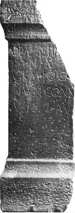 ![]() Gedenksteen van godin Nehalennia, gevonden in Colijnsplaat. In de derde regel lezen Bogaers en Gysseling Ganuenta, terwijl er duidelijk Gimiog(a) staat. Het is een manipulatie van het opschrift om vooral gelijk te krijgen. |
