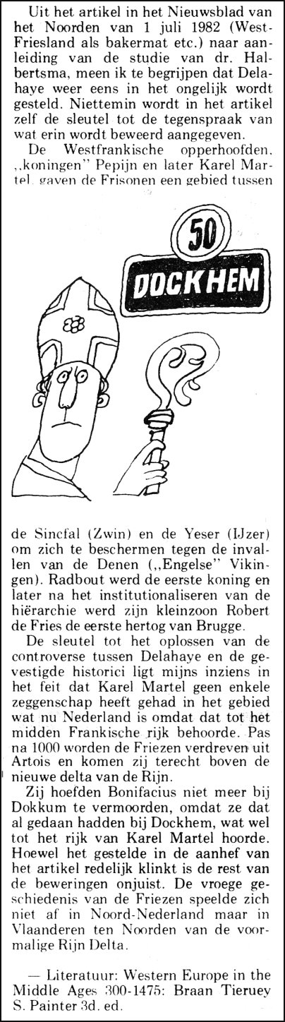 Archeoloog Halbertsma heeft bij al zijn opgravingen in Dokkum geen enkel archeologisch bewijs gevonden van vóór de 13e eeuw. Lees zijn artikel over Bonifatius' levenseinde in het licht der opgravingen. In zijn boek 'Frieslands Oudheid' (2000) vermeldt Halbertsma zelf, al was het schoorvoetend, dat in 1920 Otto Opperman al tot de conclusie kwam dat de oudste bronnen van de Nederlandse geschiedschrijving op vervalsingen berusten. De bevindingen van prof.dr. L.J.Rogier sluiten hier feilloos op aan: "vóór het jaar 1559 is van enige officiële verering van Sint Willibrordus, Sint Bonifatius en andere geloofsverkondigers in Nederland geen spoor te vinden". Volgens de traditionele geschiedenis is St.Bonifatius, de apostel van Duitsland, in 754 vermoord te Dokkum. Hoewel archeologisch en geschiedkundig is aangetoond dat Dokkum in 754 niet bestond, blijft Herrius (Herre) Halbertsma beweren dat St.Bonifatius in of bij Dokkum is vermoord door lieden die vanover de Lauwers Friesland binnen vielen. Hoewel er in Dokkum of in de verre omgeving ervan, archeologisch geen spoor gevonden is uit de 8e eeuw, blijft Halbertsma aan de traditionele geschiedenis vast houden. Met een hernieuwde opgraving in 1984 meende men te Dokkum de "wijwaterput van St.Bonifatius" te hebben gevonden. Het werd een complete desillusie. Delahaye heeft altijd beweerd dat de naam Dokkum niet van Dockynchirica afkomstig is, maar door een vervalsing van een kanunnik uit het bisdom Utrecht in de 14e eeuw via de verkorting Dockynga ten onrechte op Dokkum is toegepast. Daarmee kwam St.Bonifatius als 'onderdeel' van de grote "déplacements historiques" ook op de verkeerde plek terecht. Dockynchirica was de plaats Duinkerke in Noordwest Frankrijk, vlak over de Belgische grens. Friesland en dus ook de streek van Dokkum lagen in de periode tussen de 3e en 10e eeuw een flink stuk onder water vanwege de transgressies. Bovendien is een wijwaterput een grote fabel, aangezien de Paus had verboden om met water uit putten, waar een heidens ritueel mee verbonden was, te dopen. St.Bonifatius was zeer Rome-getrouw en zal dan ook zeker nooit met water uit putten gedoopt hebben. Lees hier Waarom Paus Johannes Paulus II bij zijn bezoek aan Nederland in 1985, terecht niet naar Dokkum ging. Halbertsma kreeg in zijn opvatting steun van ene H.A.M. Andela uit Sneek, die met enige triomf meedeelde dat Dokkum op een terp ligt van wel 7 meter + NAP. en dus niet onderhevig is geweest aan overstromingen door de transgressies. Indien we de opmerking van de heer Andela goed begrijpen, dan vrees ik dat hij met deze opmerking zijn eigen stelling ondergraaft, schreef Delahaye. De geschreven bronnen zeggen namelijk nergens dat St.Bonifatius IN Dokkum is vermoord, maar in de buurt van Dockynchirica en wel op de oever van de rivier de Burdine (wat bij Duinkerke de Bourre is). Met wat Andela geschreven heeft beweert hij dus dat St. Bonifatius en zijn gezellen onder water zijn vermoord. Het staat vast dat er in 754 nog geen duinen of dijken waren. Want als het niet onderhevig zijn aan overstromingen van Dokkum slechts aangetoond kan worden met een terp, betekent het dat de rest van het land overstroomd was. Dan valt er niemand te vermoorden aan een rivier die er niet was. En wat viel er dan te bekeren als het land overstroomd was en dus onbewoond?