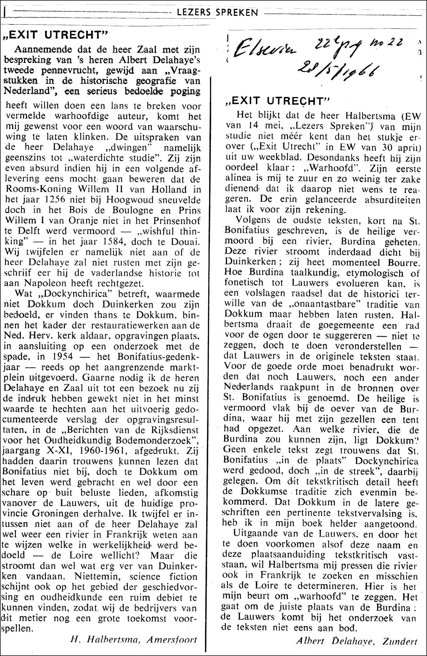 Halbertsma heeft als archeoloog werkzaam bij de ROB (Rijksdienst voor Oudheidkundig Bodemonderzoek) in 1959 een boekje geschreven over Amersfoort dat de titel draagt: "Zeven eeuwen Amersfoort". Zijn kritiek op het werk van Delahaye wordt met dit boekje danig onderuit gehaald. Als geschiedkundige heeft hij afgedaan. In "Bruit van d'Eem. Geschiedenis van Amersfoort" lezen we hierover: (Citaat) Het is rommelig van opzet en bevat ook feitelijke onjuistheden (p.26). Voor dat rommeligen en de onjuistheden: zie hierna. Iemand die meent de pretentie te hebben van deskundige te zijn op het gebied van de bewoningsgeschiedenis, laat in eigen werk menig steekje vallen. Sommige uitspraken en gevolgtrekkingen van Halbertsma zijn als controversieel ervaren. Dit geldt zeer in het bijzonder voor zijn vaste geloof in de continuïteit van de Friese bewoning vanaf de prehistorie, zoals duidelijk blijkt uit de epiloog van de handelseditie van Frieslands Oudheid. Het is een opvatting die thans door de meeste archeologen niet meer wordt gedeeld. Continuïteit van de Friese bewoning vanaf de ijzertijd werd lang aangenomen, onder meer op grond van de overlevering van oude namen van plaatsen en waterlopen. De Friese raadsheer Pieter Boeles (1873 -1961), die tevens conservator van de archeologische afdeling van het Fries museum in Leeuwarden was, leverde als eerste kritiek op deze opvatting. Maar ook Delahaye leverde daar kritiek op en toonde aan dat het bewoningshiaat veel langer heeft geduurd. Bovendien dat al die oude Friese plaatsnamen een doublure zijn van plaatsnamen in Frans-Vlaanderen. Van deplacements historiques had men in Friesland nog nooit gehoord en er daarom ook nooit onderzoek naar gedaan. Hoe kan Halbertsma en anderen dan oordelen over het werk van Delahaye dat men niet eens gelezen, laat staan begrepen heeft? Halbertsma meende Delahaye eens van repliek te moeten dienen en noemde als zijn woonplaats Klundert, terwijl Delahaye in Zundert woonde. Hieruit blijkt dat de door Delahaye aangetoonde verwarring tussen twee nagenoeg gelijk luidende plaatsnamen al verwarring wekt, laat staan als de plaatsnamen volledig identiek zijn. Er is dan zeker zorgvuldigheid geboden, anders leidt het tot onvergeeflijke fouten, wat helaas in de historische geografie van Nederland is gebeurd. Halbertsma gaat hier als deskundige op het gebied van historische geografie vreselijk onderuit. Hij weet het verschil tussen Klundert en Zundert blijkbaar niet. Bij Zundert ging hem blijkbaar geen belletje rinkelen, ofwel hij kende het geboortedorp van Vincent van Gogh ook niet. Ook de hiervoor gemaakte opmerking van Halbertsma toont al aan dat hij geen verstand heeft van historische geografie. Halbertsma betoogde dat Delahaye het Waderloe uit de oude akten als Waterloo opvatte. Dat nu heeft Delahaye nooit beweerd. Bij Delahaye was het Wattrelo in Frans-Vlaanderen. Op het gebied van culturele en historische geografie maakt hij hier onmiskenbaar een grove misser. Hoe zorgvuldig ben je dan bij je eigen determinaties geweest? Zo vindt Halbertma hiermee inderdaad zijn Waterloo. Een bijzondere opgraving van Herre Halbertsma was die op de terp van Dokkum, waar de met kleizoden opgeworpen heuvel werd aangetroffen op de plek waar Bonifatius 1200 jaar eerder was vermoord. Het onderzoek - in het Bonifatius-jaar trok grote landelijke belangstelling. De opgraving werd op 4 juli 1954 zelfs bezocht door koningin Juliana, die zich door Halbertsma uitvoerig liet informeren. Overtuigd was de koningin blijkbaar niet echt, want het standbeeld van Bonifatius in Dokkum liet zij in 1962 door haar dochter prinses Beatrix onthullen. Die eer was haar blijkbaar te na. Nadien bleek het hele Dokkum-verhaal te berusten op mythes en vrome legenden, wat ook Halbertsma niet kon ontkennen. Zie hierna. ![]() Wat schrijft Halbertsma in 1967 zelf over die put van St.Bonifatius? "Er werden geen aanwijzingen gevonden dat deze put ouder is dan het laatste kwart van de 16e eeuw en derhalve niet de "fons" kan zijn, welke gedurende de Middeleeuwen het doelwit van de Bonifatius-pelgrims was". (Bron: H.Halbertsma). De zogenaamde put van Bonifatius was aanvankelijk uit de 14e eeuw en blijkt dus nu niet ouder te zijn dan de 16e eeuw. De pelgrims waren, net als Halbertsma, wel erg goedgelovig. Met zoveel geloof, hebben ze de bekering door het water in de put van Bonifatius niet echt nodig gehad. Deze bevindingen (van Halbertma zelf) hebben hem blijkbaar niet aan het denken gezet. Hij is ook nooit teruggekomen op zijn uitspraken over de opvattingen van Delahaye aangezien hij maar al te goed begreep dat die volkomen gelijk had. Dat toegeven is natuurlijk wel dodelijk voor je eigen prestige, dus dat gebeurde dan ook niet. Soms ook zag Halbertsma het licht en bevestigde daarmee de visie van Albert Delahaye. In 1989 schreef Halbertsma aan E.H.Cordfunke (p.110): 'Niemand bleek Frieslands Oudheid te hebben gelezen, dus opnieuw die onzin over de overwinning van Karel Martel op Radbod, de twee oorlogen tussen Pippijn en Radbod, de verkeerde Bonifatiusbron etc.' En over de zogenaamde konings terp in Wijnaldurn: 'Als men Frieslands Oudheid goed gelezen had, zou men weten dat Radbod aanzienlijke vloten tot zijn beschikking had en met amfibielegers de Franken ernstig bedreigde tot vlak voor zijn dood in 719 toe. Zo'n machtig man verschuilt zich niet in Wijnaldum waar je heus geen geduchte vloot kunt uitrusten of duizenden militairen kunt verzamelen. Hier krijgt Albert Delahaye op 2 belangrijke punten gelijk van H.Halbertsma. De juiste conclusies hebben hij en andere historici er nooit uit getrokken. In een antwoord op een ingezonden brief van Halbertsma, die de term 'warhoofdige auteur' gebruikt, geeft Delahaye hem repliek en zegt dat het nu zijn beurt is om warhoofd te zeggen. (Zie hieronder: klik op de afbeelding voor een vergroting). Lees beide ingezonden brieven nauwkeurig door. Zo werkt wetenschap blijkbaar. Voor het in de brief van Halbertsma genoemde bericht van de R.O.B. jaargang X-X