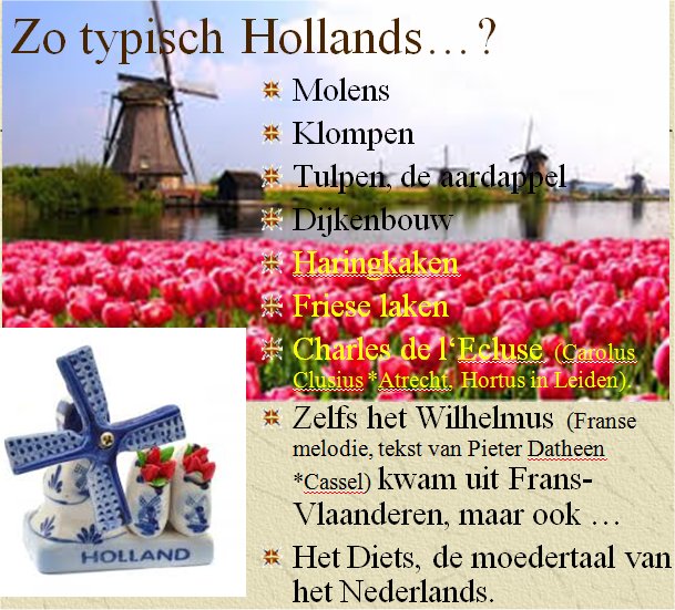 Veel typische 'Hollandse' zaken danken we aan 'import' vanuit het buitenland. Het zo typische Delfst Blauw danken aan Vlamingen. Toen in 1585 Amtwerpen in handen viel van de Spanjaarden, verkastten veel Vlaamse protestantse plateelbakkers naar Middelburg, Haarlem en Amsterdam, later naar Delft, waar veel leegstand was. Het het draaiorgel, nog zo'n icoon van Nederland, kwam ook uit het zuiden, vanuit Frankrijk via België. Net als de andere iconen van Holland, zoals de Klomp, de Tulp en de Molen. En dan noemen we nog de Nederlandse cartografische traditie die schatplichtig was aan de Vlaamse cartografen zoals Plancius en de wereldatlas van Blaue die daarop voortborduurde. En wat te denken van Adriaan Valerius 'Gedenck-clanck', wiens vader François Valéry uit Frankrijk kwam. Zijn liederen als "Merck toch hoe sterck' en 'Wilt heden nu treden' zijn niet gek voor een allochtoon. Polder dan? Helaas. In de 8e eeuw kende men in Frans-Vlaanderen al waterstaatkundige werken (o.a. dicke) tegen overstromingen. Dat is 3 eeuwen voordat men in Nederland hieraan begon. Het woord 'polder' is ontstaan uit 'polre' (poel) dat aangeslibd en bedijkt land was, dat in Nederland het eerste gebeurde in Zeeland.