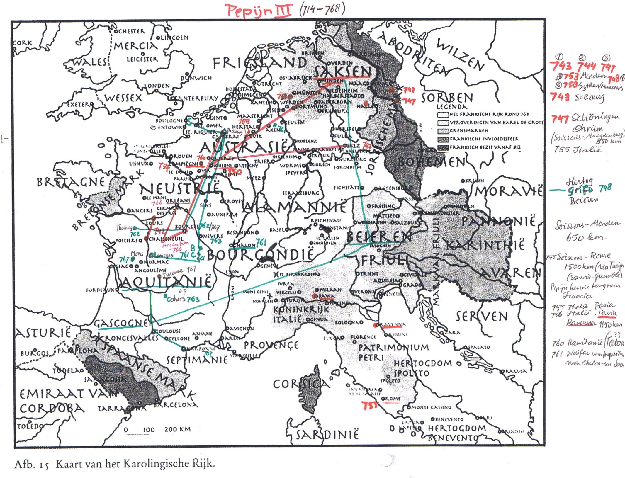 "De een heeft hij door beloningen, de andere door bedreigingen gewonnen", aldus Alcuinus, die daarmee geen hofschrijver genoemd kan worden. Ook Alcuinus had al menig bezwaar op het beleid en de werkwijze van Karel de Grote en vergat dat niet te vermelden. Alcuinus was het wel vaker niet eens met Karel de Grote en liet dat ook merken. Uit twee toevallige bewaarde brieven blijkt zich in Tours in de jaren 801/802 in en rond de basiliek van de heilige Martinus een tumultueuze gebeurtenis afgespeeld hebben. Het conflict concentreerde zich blijkbaar op de vraag of iemand die veroordeeld was nog het recht had in een kerk bescherming te zoeken. Voor bisschop Theodulf van Orleans en Karel de Grote was de zaak duidelijk: een dergelijk recht had zo'n veroordeelde niet. Voor Alcuinus was dit echter niet zo. Hij meende dat een zondaar altijd het recht had in een kerk vergeving te zoeken. Opmerkelijk is dat Alcuinus in zijn argumentatie een uitvoerig beroep doet op Merovingische conciliebepalingen, het Romeinse recht en de geschiedenis om zijn standpunt te onderbouwen, maar dat hij geen enkel capitulare van Frankische vorsten aanhaalt. Opmerkelijk is ook dat Karel de Grote van de Bijbelse opvatting waarbij Christus aan het kruis zelfs nog een misdadiger vergeeft, weinig begrepen heeft. Vanaf die tijd is de verhouding tussen Karel de Grote en Alcuinus verstoord. Alcuinus is toch lange tijd bepalend geweest voor de Karolingische politiek. De belangrijkste raadsman van Karel de Grote overleed in 804. Erg Christelijk waren de opvattingen van Karel de Grote dus niet. Een grote mythe. Dat Karel de Grote een groot en machtig rijk heeft gesticht is een fabel. Volgens de schriftelijke bronnen had zijn vader Pepijn III veel streken en gebieden al in bezit die aan de veroveringen van Karel de Grote worden toegeschreven, tenminste volgens de traditionele geschiedschrijving. Pepijn streed al tegen de Saksen, de Friezen en in Beieren en Italië. Zie het kaartje hieronder. (Klik op het kaartje voor een vergroting). ![]() Ook de halfbroer van Pepijn, hertog Grifo van Beieren, maakte lange veldtochten tot wel 800 km enkele reis, zoals van Beieren naar Gascogne en Aquitanië. Op het kaartje de groene lijnen. Maar was dit wel zo? Volgens de opvattingen van Albert Delahaye heeft zich dit alles voorgedaan binnen de kern van het Frankische Rijk in Neustrië en Austrasië, zoals op dit kaartje meer realistisch wordt aangegeven. Neustrië en Austrasië lagen geheel binnen het huidige Frankrijk tussen de Loire en de Ardennen. Lees meer over Neustrië en Austrasië. De Saksen woonden aan de kust van Het Kanaal. Lees meer over de Saksen.