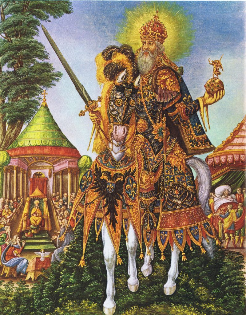 Karel de Grote was een meedogenloos vorst: de keuze voor overwonnenen was het kruis of het zwaard, ofwel de doop of de dood, perfect gesymboliseerd op onderstaand schilderij van Albrecht Dürer. De Karelsprijs die sinds 1950 jaarlijks wordt uitgereikt door de stad Aken, vertegenwoordigt de volgende uitgangspunten: het doel is het vormen van een eenheid op vrijwillige basis van alle Europese volkeren, om dan met de hieruit ontstane kracht de hoogste aardse deugden (vrijheid, menselijkheid en vrede) te verdedigen en onderdrukte en noodlijdende volkeren te helpen. (Bron: https://www.aachen.de/NL/sb/pr_az/karls_pr/index.html). Het blijkt in schril contrast met de werkelijkheid van Karel de Grote.