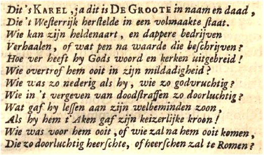 De Karolingische renaissance.De 'Karolingische renaissance' (zie afbeelding uit de 16e eeuw hiernaast) uitte zich in een uitbundig en overdadig rijk versierde bouw- en sierkunst. Daarmee werd feitelijk slechts het grote verschil in rijkdom tussen de Karolingische elite en de arme bevolking pijnlijk blootgelegd. Zelfs dit was een smet op het blazoen van Karel de Grote, hoewel de Karolingische Renaissance pas na Karel de Grote ontstond. Aan armoedebestrijding heeft Karel de Grote weinig tot niets gedaan. De Karolingische renaissance sloot precies aan bij de persoonsverheerlijking zoals die door de Duitse (sic!) schrijvers en de vele legenden en sagen is overgeleverd. Een ware kijk op de geschiedenis zal ook aan de mythevorming rondom Karel de Grote een einde moeten maken. Klik hier voor het hoofdstuk over Einhard |