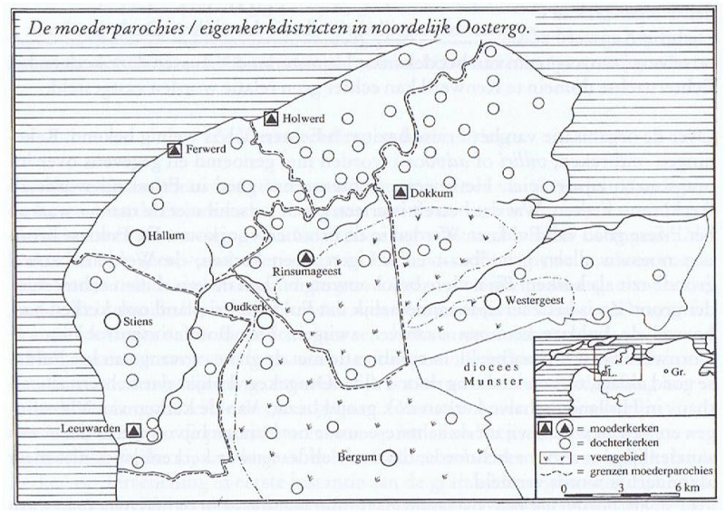Traditioneel blijkt dat zowel het door Bonifatius gestichte klooster te Fulda als het klooster te Werden waaraan de naam van Ludger is verbonden, veel goederen bezeten heeft in Friesland en Groningen. Ook Wïllibrords Echternach had bezittingen in Groningen. Op deze bezittingen worden echter geen kerken vermeld, schrijft Van den Berg in het hiervoor genoemde artikel.