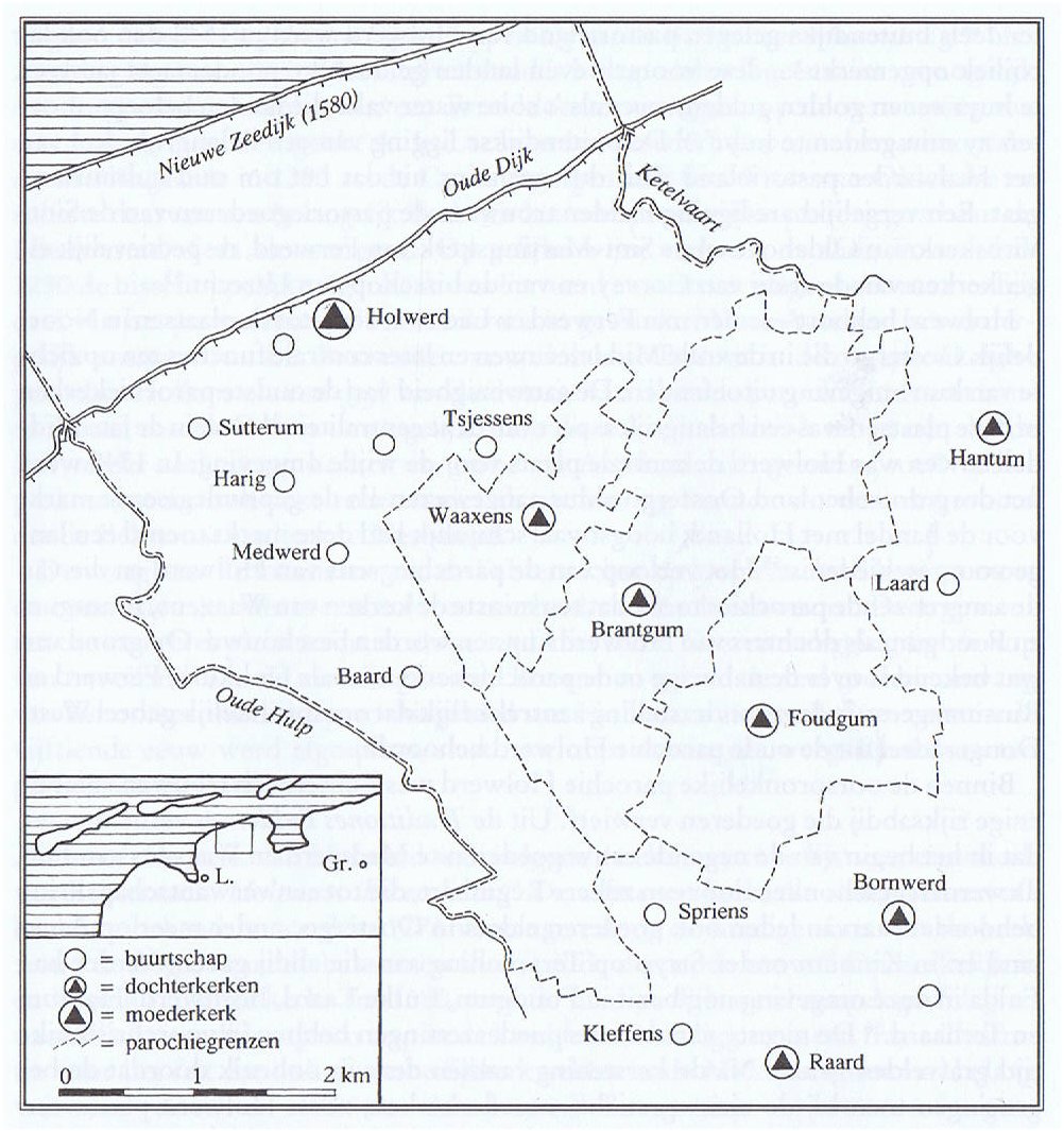 De parochie Holwerd en enkele van haar dochterparochies. Ten zuiden van Holwerd ligt de buurtschap Harig, waarvan de naam zou duiden op 'een oud heiligdom'.