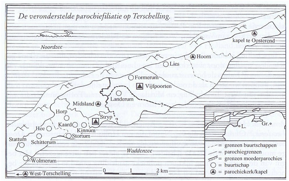 - De prediking van Willibrord in Friesland en op Ameland, Terschelling  (kaart hiernaast: klik op de kaart voor een vergroting) en op Holwerd is eveneens een grote mythe en het gevolg van onjuiste interpretaties van klassieke teksten, maar vooral de doublures van plaatsnamen. Het kaartje toont de 'veronderstelde' parochies op Terschelling. Woonden er op Terschelling in de 8ste eeuw zoveel mensen dat er liefst 4 kerken nodig waren? Momenteel heeft Terschelling nog geen 5000 inwoners.