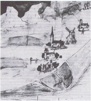 Fragment van een kaart van Jacob Heeres uit 1556. Afgebeeld zijn de kerk en het herenhof te Stryp en de kerken van Midsland en Vijfpoorten/Formerum.