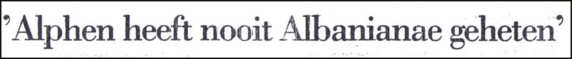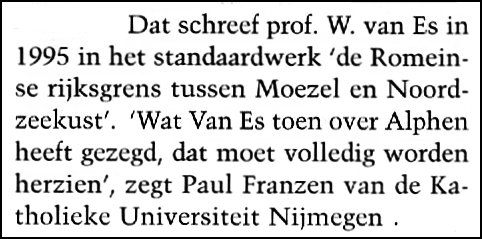 ![]() De visie van Albert Delahaye. Het enige bewijs van de naam Albanianis is de Peutingerkaart. Echter die kaart is een falsum uit de 16e eeuw. Albanianis wordt door geen enkele klassieke bron als castellum genoemd. Toch heeft men het er in de Duits-/Nederlandse traditie wel van gemaakt. Albanianis is Alembon, op 5 km afstand van Hardinghen en op 6 km van Le Mat, wat de juiste afstand is. De naam is er een met lokale kleur, daar hij is afgeleid van de witte (albi-denk aan het Nederlandse woord albino) kalksteen, die hier vanouds gedolven werd als bouwmateriaal, en die in deze streek op tal van plaatsen in de flanken van de heuvels zichtbaar is. Etymologisch heeft de naam Alphen geen enkele relatie met Albanianis, ook al zijn de eerste 2 letters gelijk. Tussen Albanianis en Alphen zit een historisch hiaat van 10 eeuwen en een naamkundig hiaat van een Romaans naar een Germaans woord. Zonder tussenvormen is er geen etymologie aannemelijk te maken. De Nederlandse traditie. In Alphen aan de Rijn zijn fundamenten gevonden die 'waarschijnlijk' als onderbouw voor de muur van een Romeins fort hebben gediend. Verder gestempelde bakstenen, Romeinse munten en scherven aardewerk. Daar heeft de plaats Albanianae gelegen, aldus Byvanck (o.c. p.416-417). Byvanck weet de naam van de plaats al, zonder daarvoor aanwijzingen of bewijzen aan te dragen. Van Es (o.c. p.100) schrijft daarover: "Er zijn meer of minder duidelijke sporen uit de Romeinse tijd gevonden. De gevonden nederzettingssporen wijzen vrij duidelijk in de richting van een Castellum". Er is dus geen castellum vastgesteld, maar er zou er een geweest kunnen zijn. Ondanks de vele kleine opgravingen die de afgelopen decennia in het centrum van Alphen hebben plaatsgevonden en er veel militaria die daarbij zijn aangetroffen, zijn we over vorm en omvang van de versterking slecht ingelicht. Een castellum wordt het meest waarschijnlijk geacht, hoewel noch voor de grachten, noch voor de wal of ommuring een onomstotelijk bewijs is geleverd. De oudste vondsten die duiden op Romeinse aanwezigheid dateren uit circa 40. Op grond van dakpanstempels wordt aangenomen dat de cohors VI Breucorum voor een onbepaalde periode in Alphen was gestationeerd. het einde van de militaire bezetting wordt voorlopig rond het midden van de 3e eeuw geplaatst. Zowel ten westen als ten oosten zijn bij opgravingen resten van vici aangesneden. Waarschijnlijk gaat het hier om opslagloodsen van 40 m. lengte. (Bechert, o.c. p.91-92). Een quote uit Westerheem 2 van april 2014: Het castellum in Alphen aan de Rijn (volgens de traditie Albaniana) is in gebruik geweest van 40 tot circa 270 n.Chr. Uit de laatste periode van het castellum (235-270) is slechts één munt gevonden. Enkele opmerkingen: |